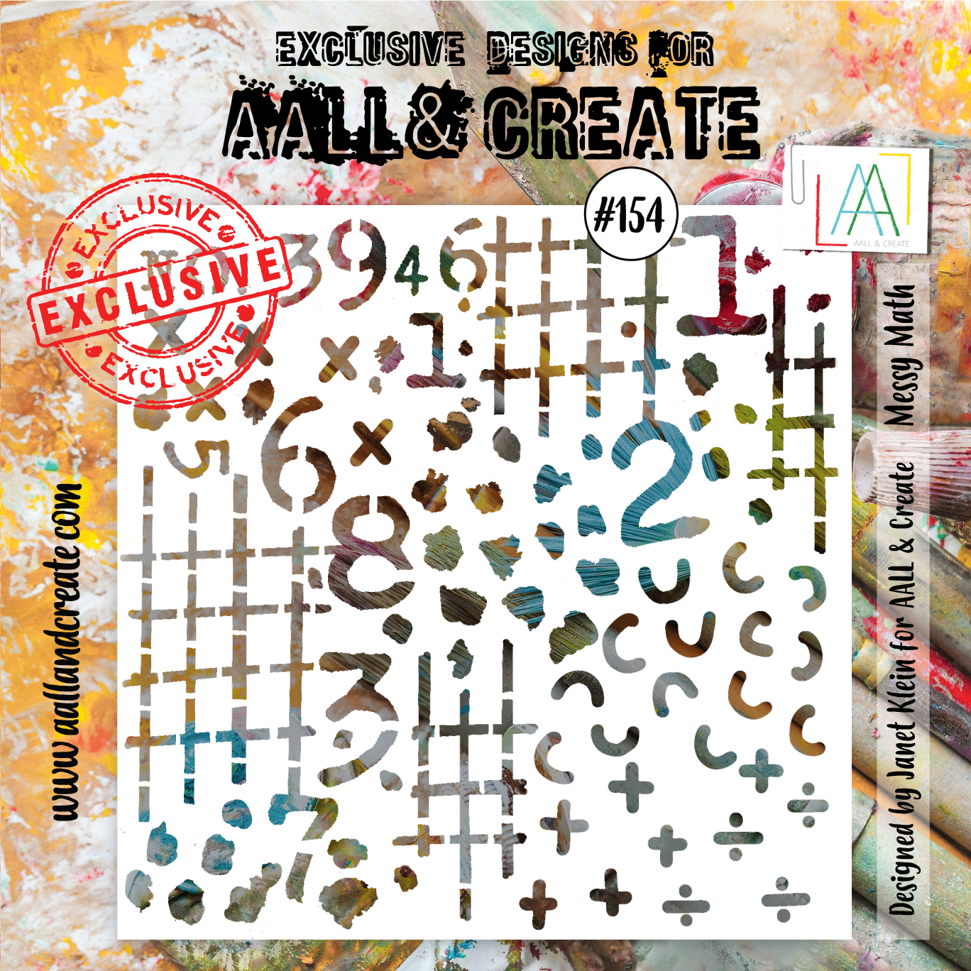 The AALL & Create Messy Math 6x6 Stencil is a crafting tool designed by Janet Klein. It is a 6 x 6 inch stencil made from high-quality, precision laser-cut 250-micron Mylar. This stencil features a collage of various mathematical elements, including numbers, grids, half circles, plus (+) and minus (-) signs, division signs, and splotches.