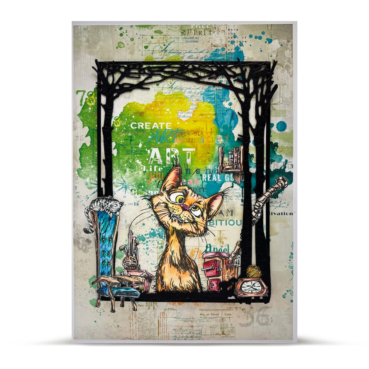AALL & Create Mischief Meow A6 Clear Stamps, designed by Autour De Mwa & Co. for the Streetwise Snouts Collection, offer a delightful assortment of whimsical pets. Measuring 6 x 4 inches, this set includes 10 deeply etched photopolymer stamps, featuring the face of a crazy, furry cat, a tall chair with a kitten sleeping on the back, a fish, a clock, a lantern, a ball of yarn, a shelf of books, a box, a stove, and pipes—perfect for adding playful, mischievous charm to your projects.