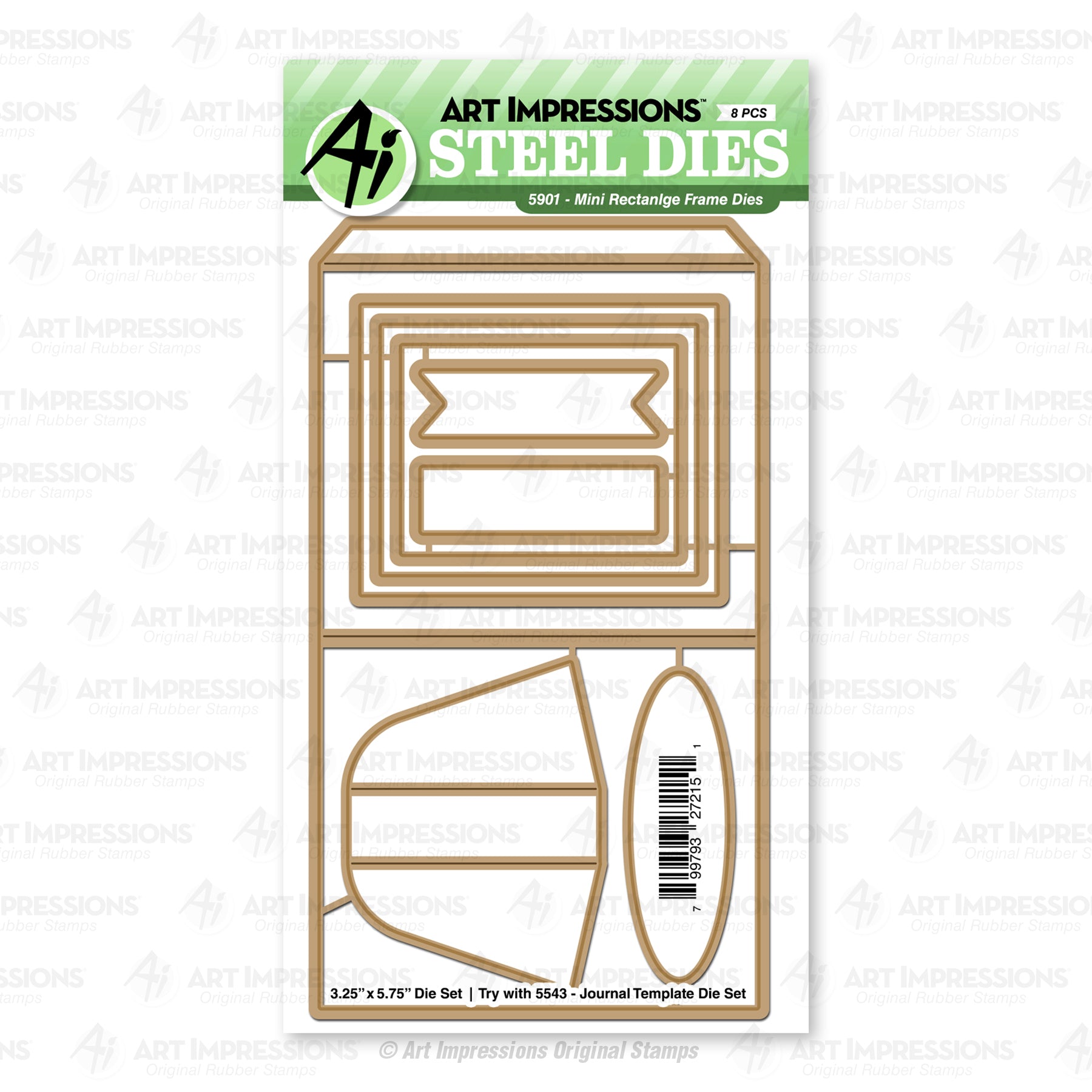 Elevate your papercrafting with Art Impressions' Mini Rectangle Frame Dies. This intricate 8 piece steel die set features a fold-over frame, stand, and various rectangle & banner designs. Perfect for adding elegance and sophistication to your projects. Luxurious and exclusive, just like your creative visions. Overall set dimensions are approximately 3.25 x 5.75 inches.