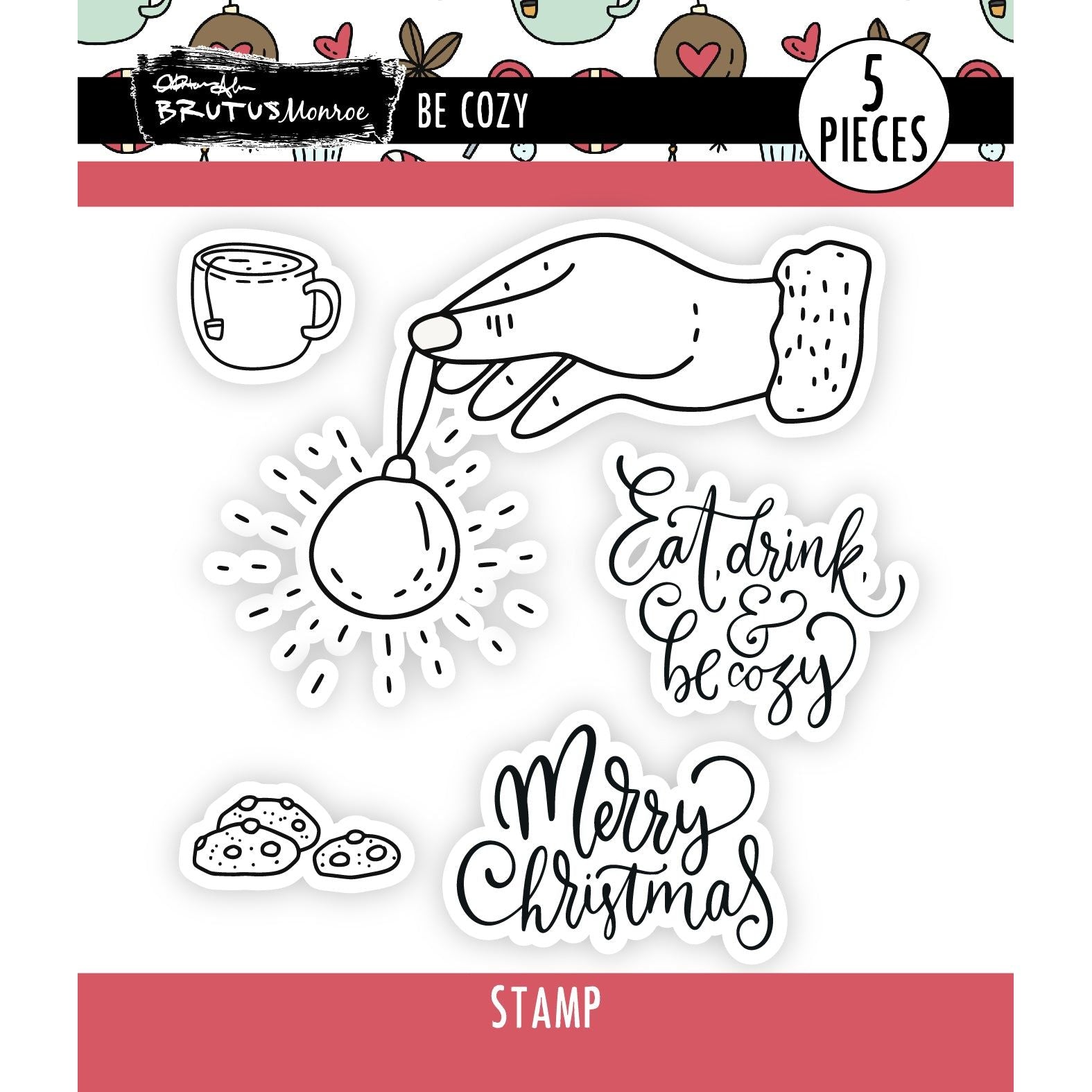Get cozy this holiday season with Brutus Monroe Be Cozy Clear Stamps from the Merry Making & Snowflake Collection. This 4 x 4-inch clear photopolymer stamp set includes 5 pieces inspired by the magic of Christmas. The set features a hand holding a sparkling ornament, a cup of tea, cookies, and the festive sentiments "Eat, Drink & Be Cozy" and "Merry Christmas." Perfect for creating warm and cheerful holiday cards and crafts!