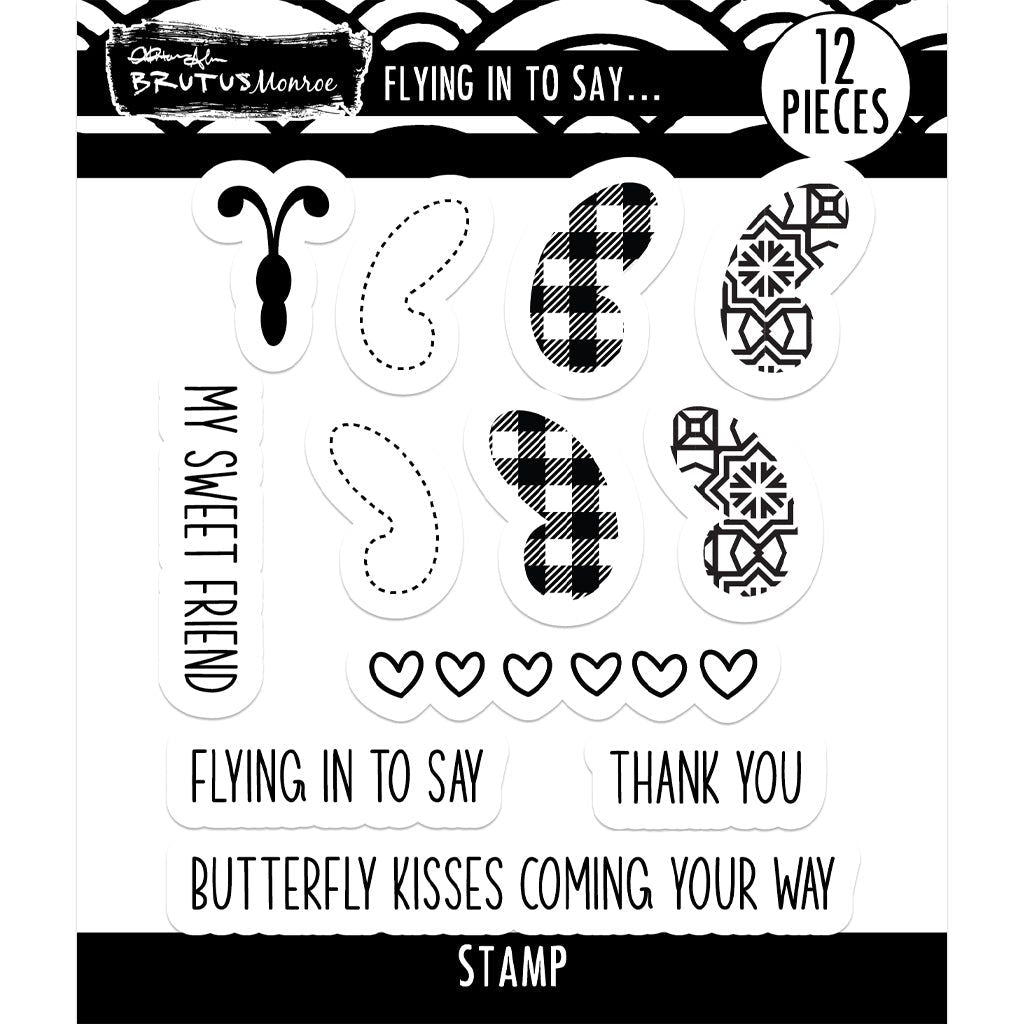 Brutus Monroe Flying In To Say... Clear Stamps are part of the Create Your Own Ending Friendship Release. This 4 x 4-inch clear photopolymer stamp set includes 12 pieces. It features a butterfly body with various wing options, including dotted outlines, mosaic floral, and plaid patterns. The set also includes a row of hearts and the sentiments "My Sweet Friend," "Flying in to Say," "Thank You," and "Butterfly kisses coming your way." It coordinates with the Hello Butterfly Dies (BRU7042-2).