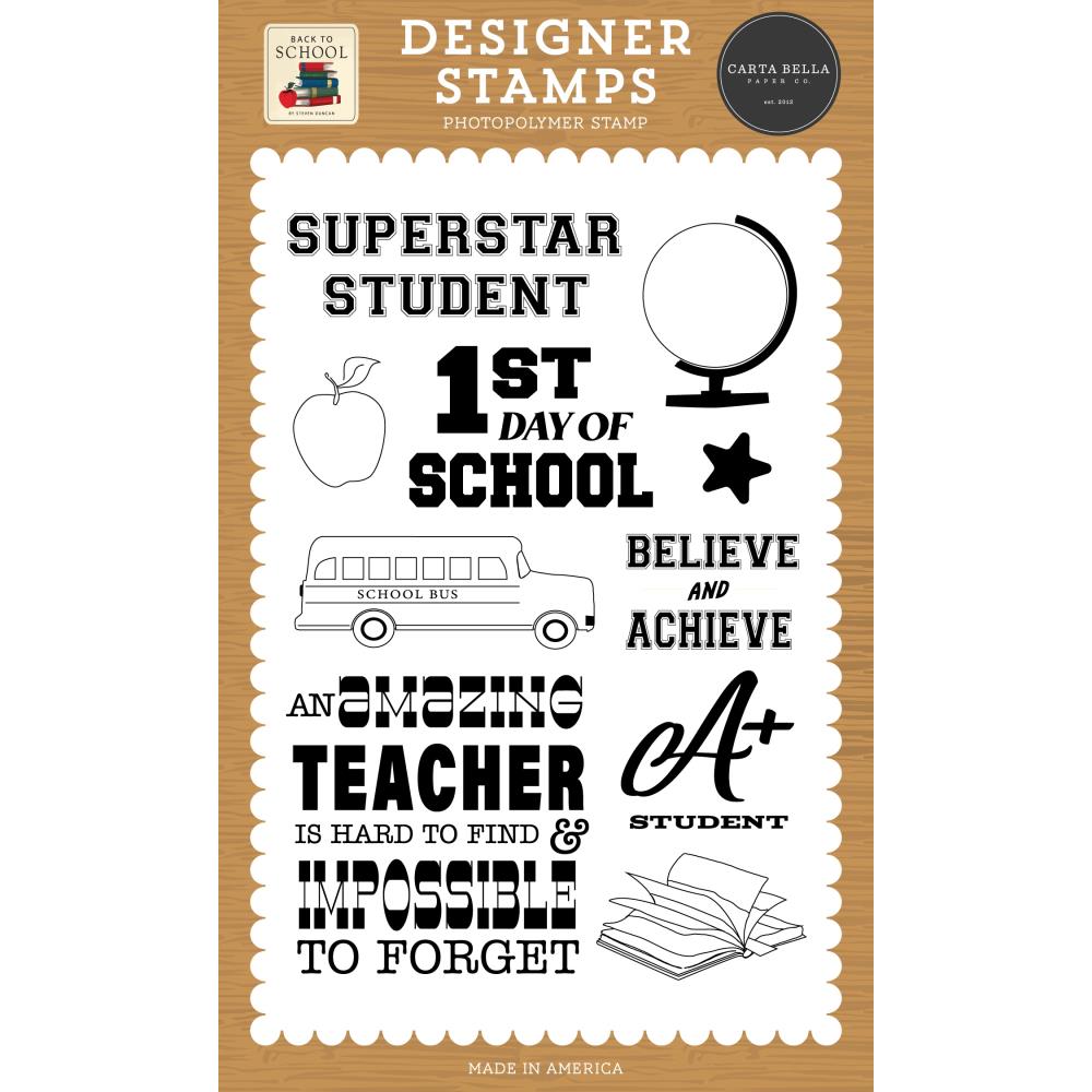 Enhance your paper crafting projects with this 4 x 6 inch clear stamp set from Carta Bella. Created by designer Steven Duncan, this high quality stamp features detailed images of an apple, book, school bus, globe, and star. Perfect for a variety of projects including cardmaking and scrapbooking, this stamp will add professional and precise designs with ease. Simply mount it to an acrylic block (sold separately) and let your creativity take over. Add a touch of expertise to your projects with this versatile and educational stamp set.