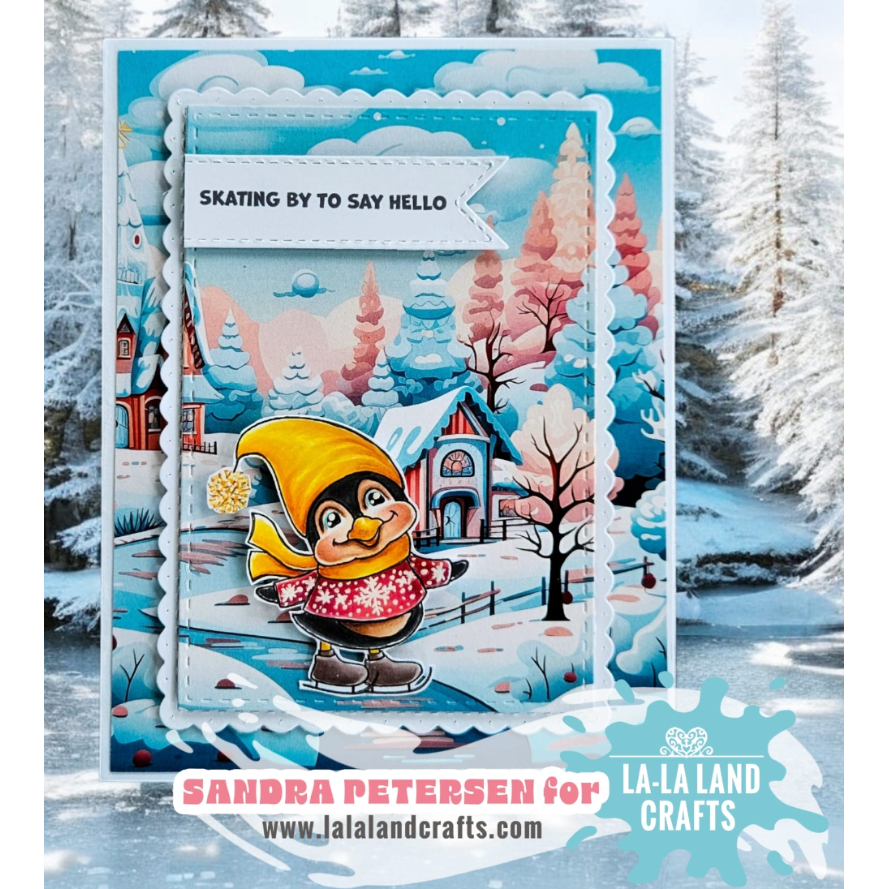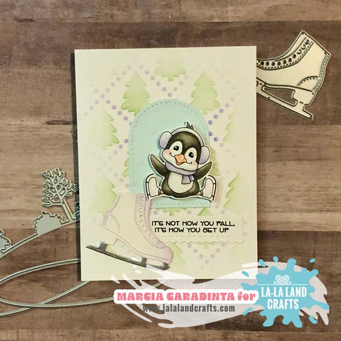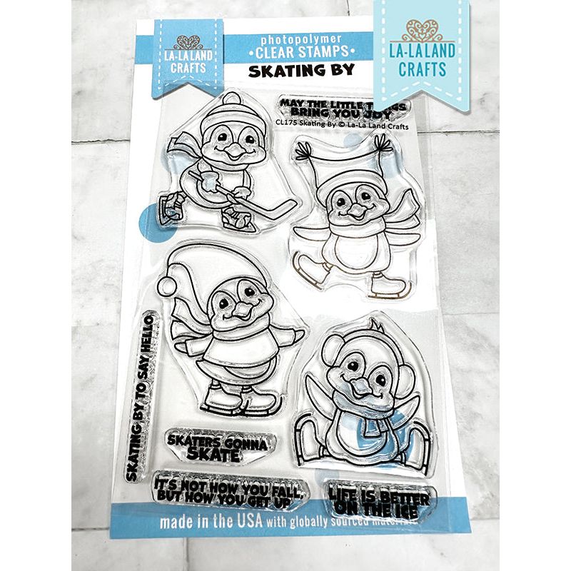 The La-La Land Crafts Skating By Clear Stamps set is a 4x6 inch clear stamp collection featuring four adorable penguins on ice skates! Three penguins are joyfully skating, one has taken a little tumble, and another is playing hockey. The set also includes 5 cheerful sentiments, all designed for coloring, making it perfect for cardmaking, scrapbooking, planners, and other crafts. Made in the USA from high-quality photopolymer, these stamps are latex-free, non-toxic, and resist yellowing, ensuring long-lasting clarity and durability.