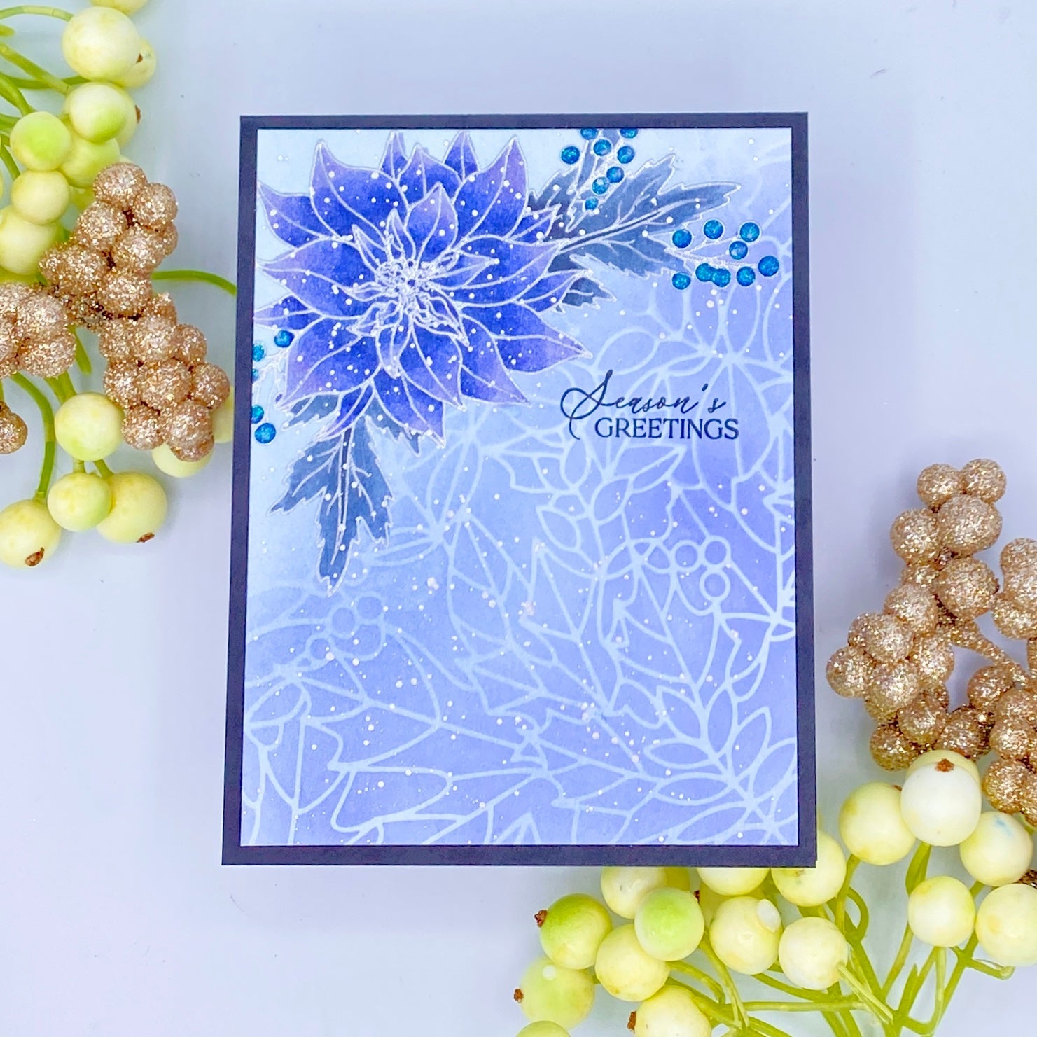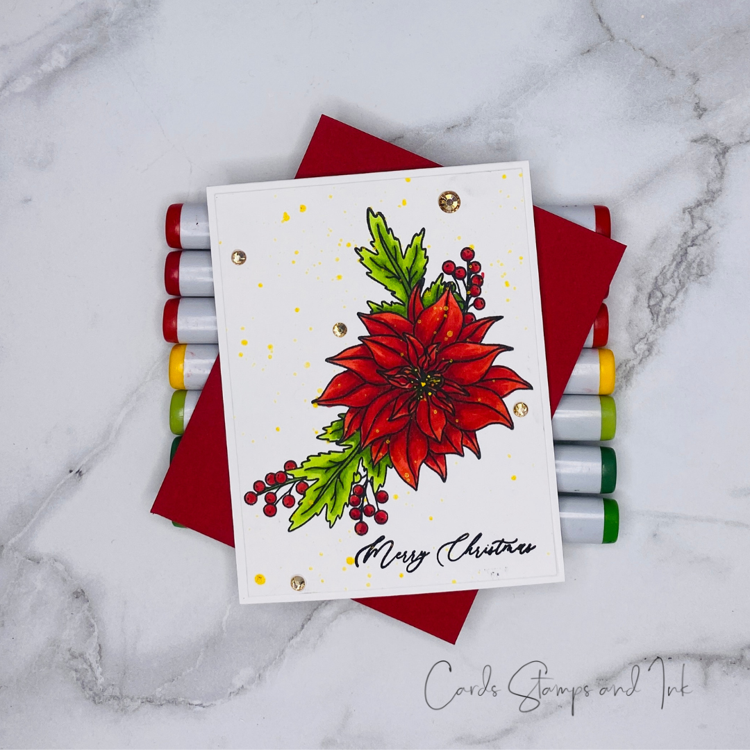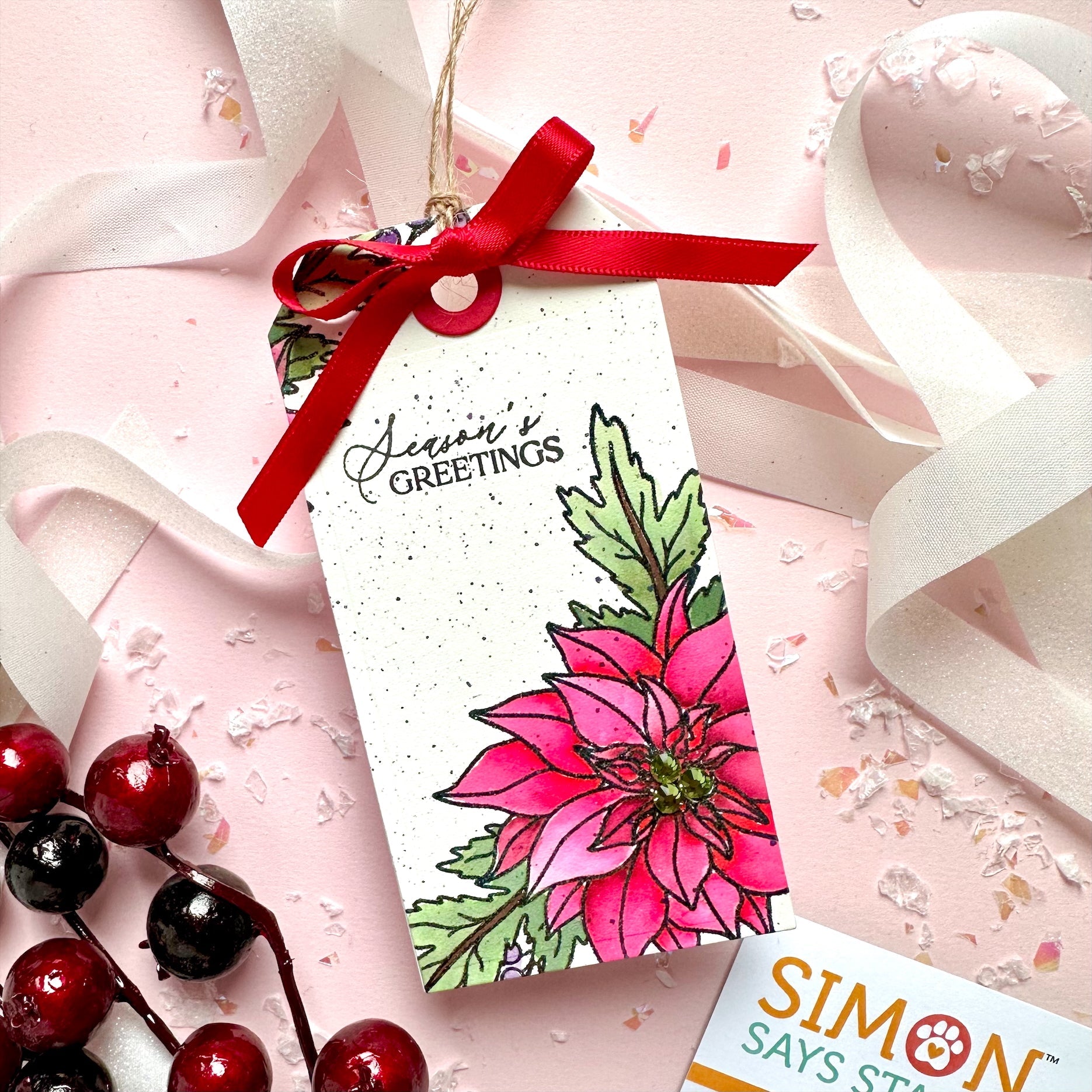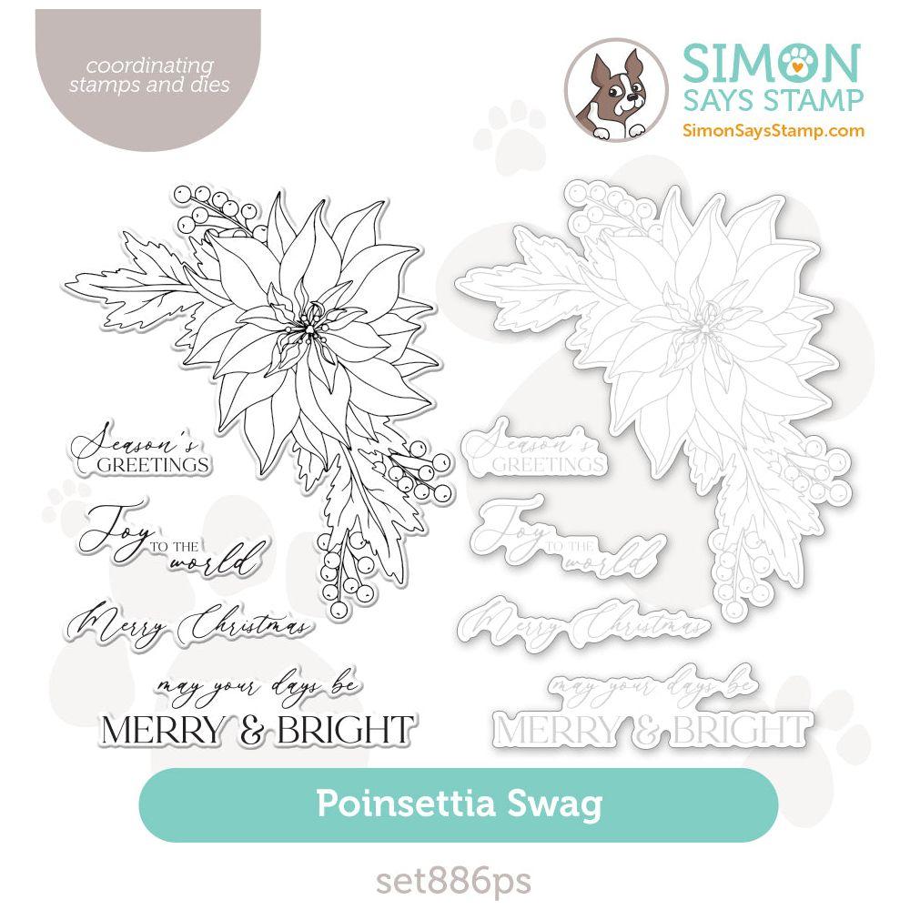 The Simon Says Stamp Poinsettia Swag stamp and die set offers a beautiful, festive focal point for your holiday crafting projects. The main image features an elegant poinsettia surrounded by delicate greenery and berries, perfect for adding a touch of seasonal cheer to cards, gift tags, and more.