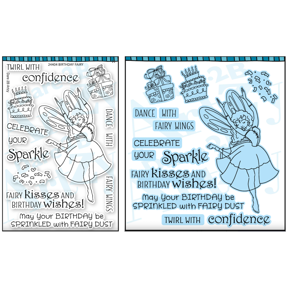 The Dare 2B Artzy Birthday Fairy Stamp and Die Bundle adds enchantment to your crafting projects. The 4 x 6 inch Birthday Fairy Clear Stamp Set features a whimsical fairy, playful confetti, charming presents, a delicious cake, and five delightful sentiments, including,