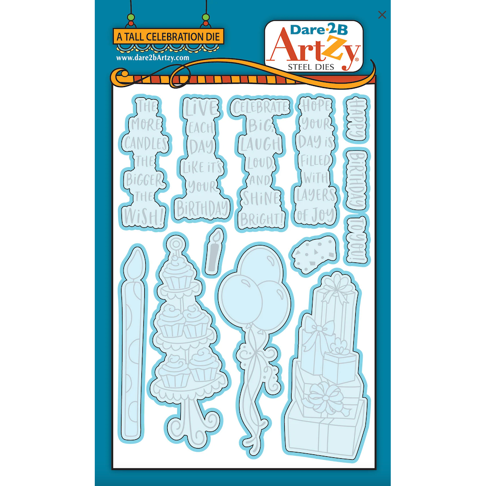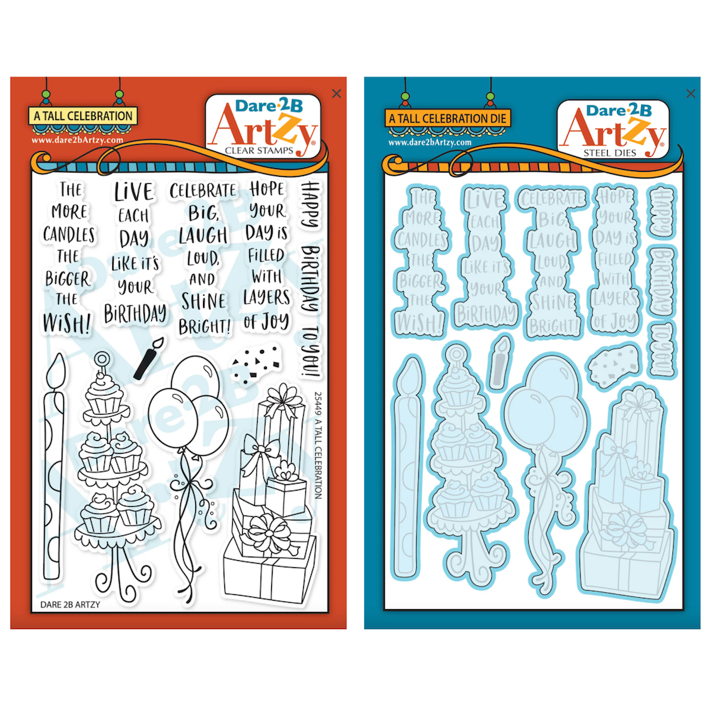 Dare 2B Artzy Tall Celebration Stamps and Dies Bundle pairs the coordinating Tall Celebration Clear Stamp Set and Die Set for bold, dimensional birthday and celebration projects. The 4 x 6 inch stamp set features playful sentiments arranged in a tall, skinny format—perfect for tucking into narrow spaces—along with coordinating images including a birthday candle, cupcake display, balloon bundle, stacked gifts, and accent details. Coordinating dies cut out each of the tall images for crisp edges, clean layers, and polished results without fussy cutting.