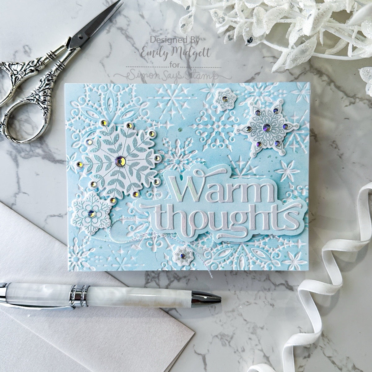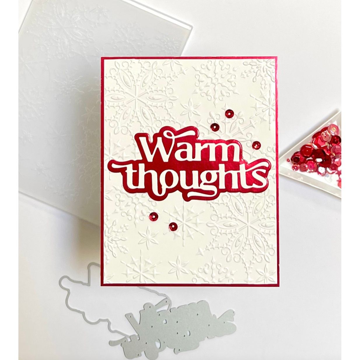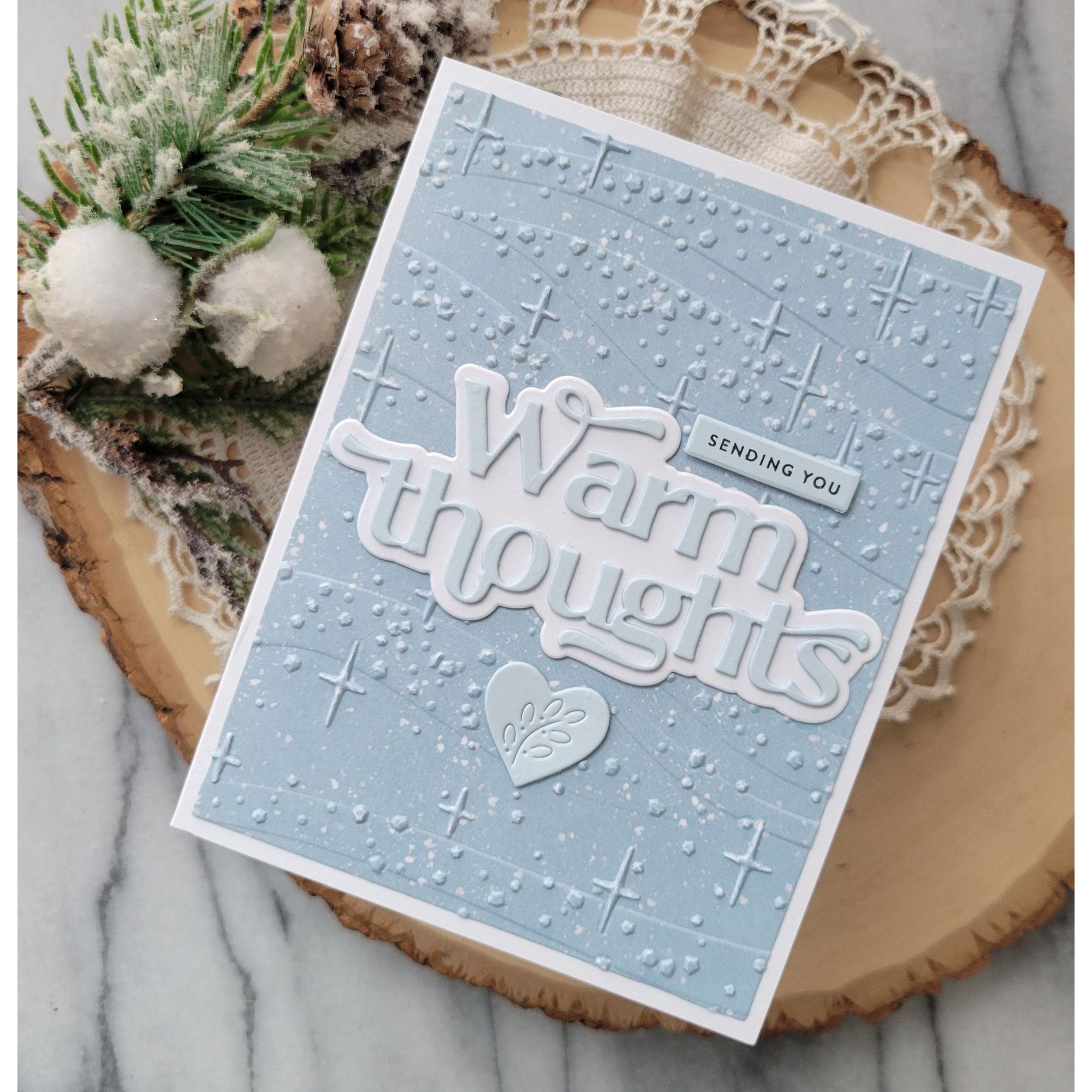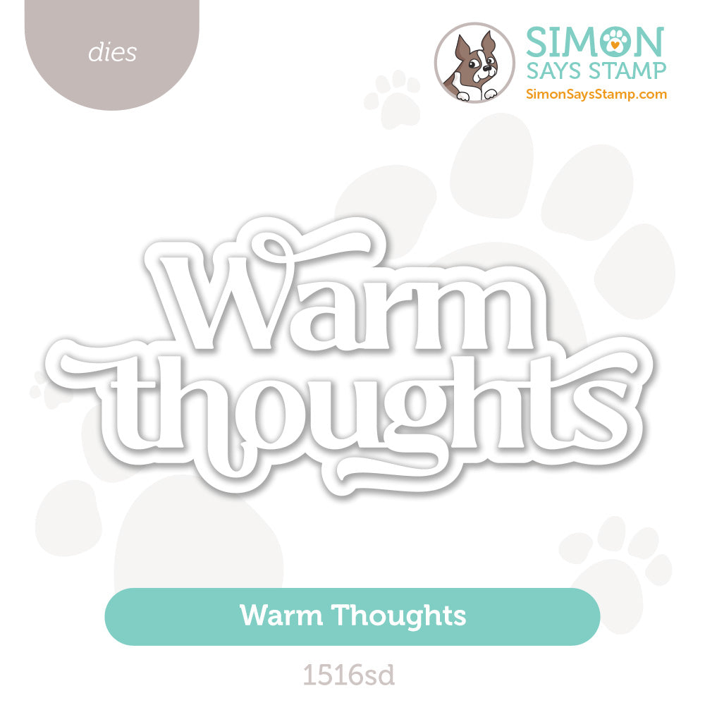 The Simon Says Stamp Warm Thoughts die cuts the sentiment “Warm thoughts” in a decorative font along with a coordinating shadow outline for easy layering.
