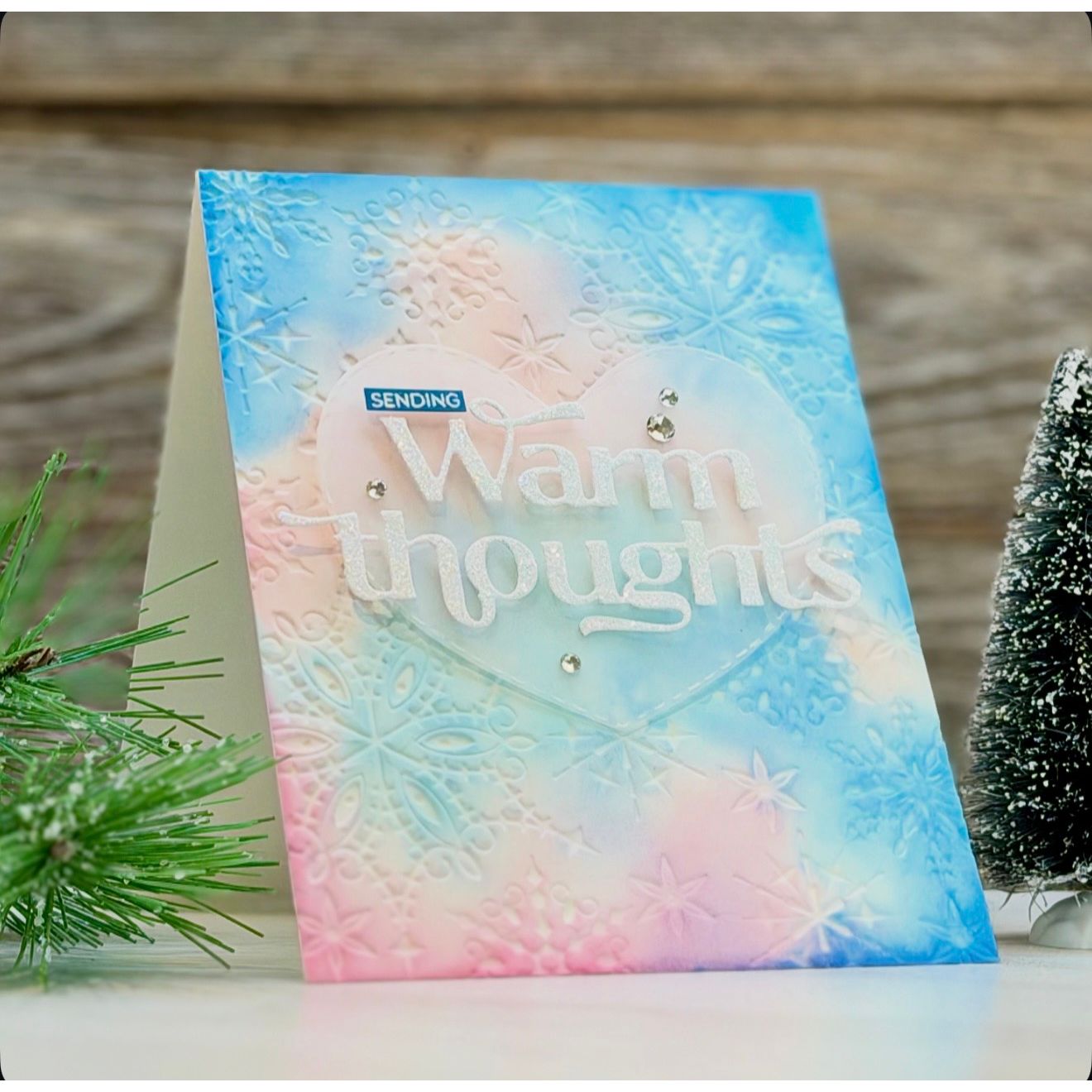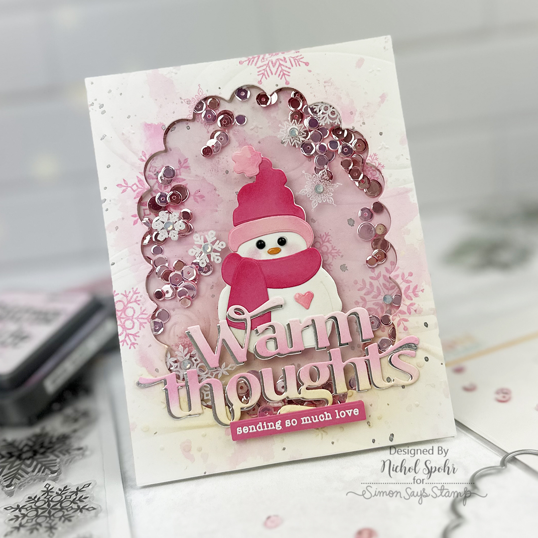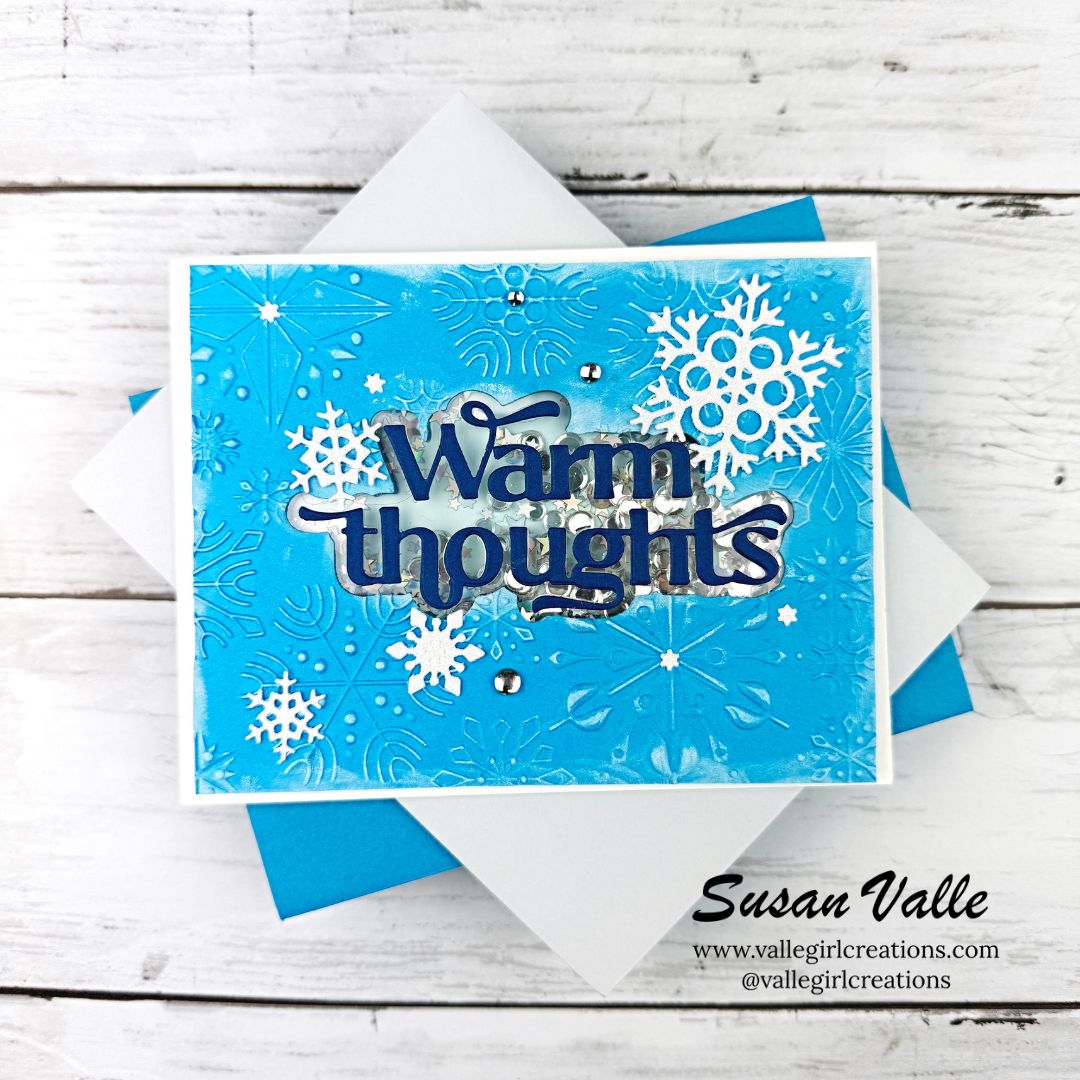 The Simon Says Stamp Warm Thoughts die cuts the sentiment “Warm thoughts” in a decorative font along with a coordinating shadow outline for easy layering.
