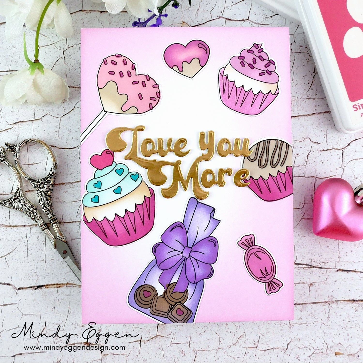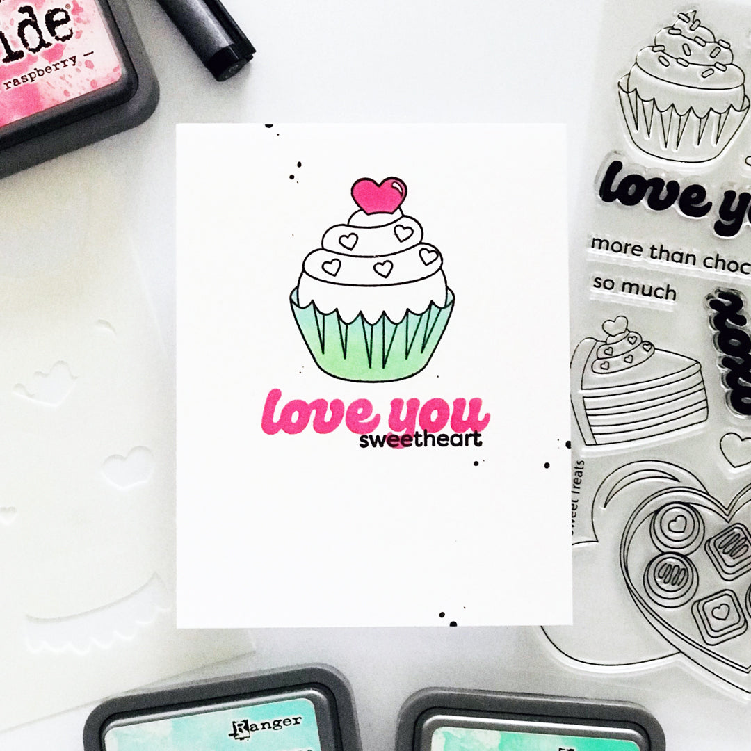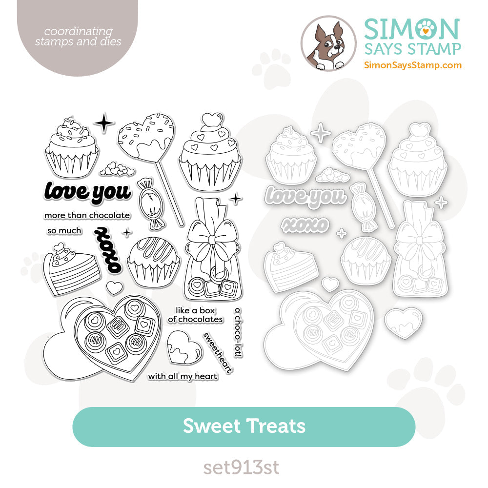 Dive into sweetness with the Simon Says Stamp Sweet Treats stamps and dies, perfect for any confectionery enthusiast. This delightful set includes a variety of treats, from cupcakes and heart-shaped lollipops to a layered cake slice and a heart-shaped box of chocolates.