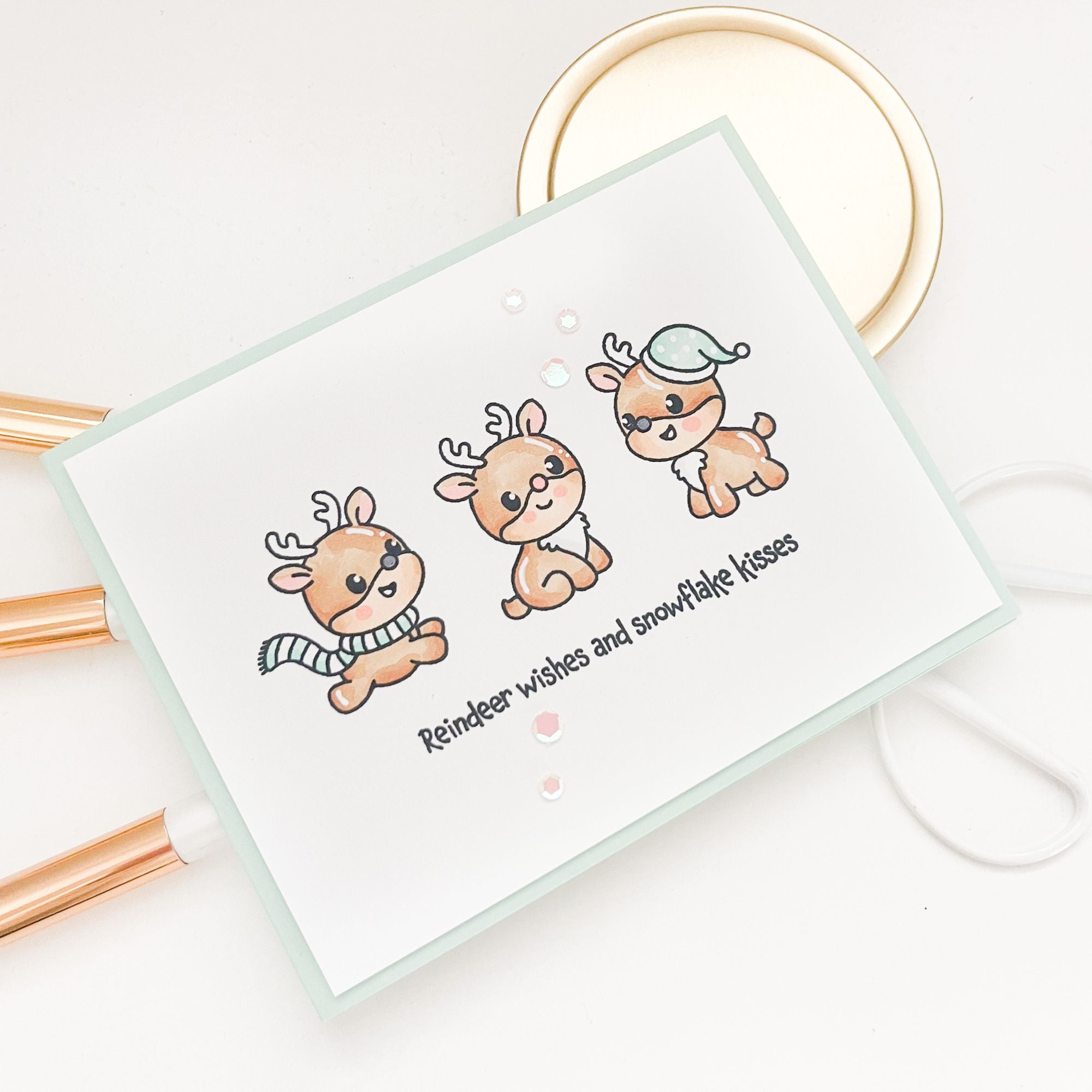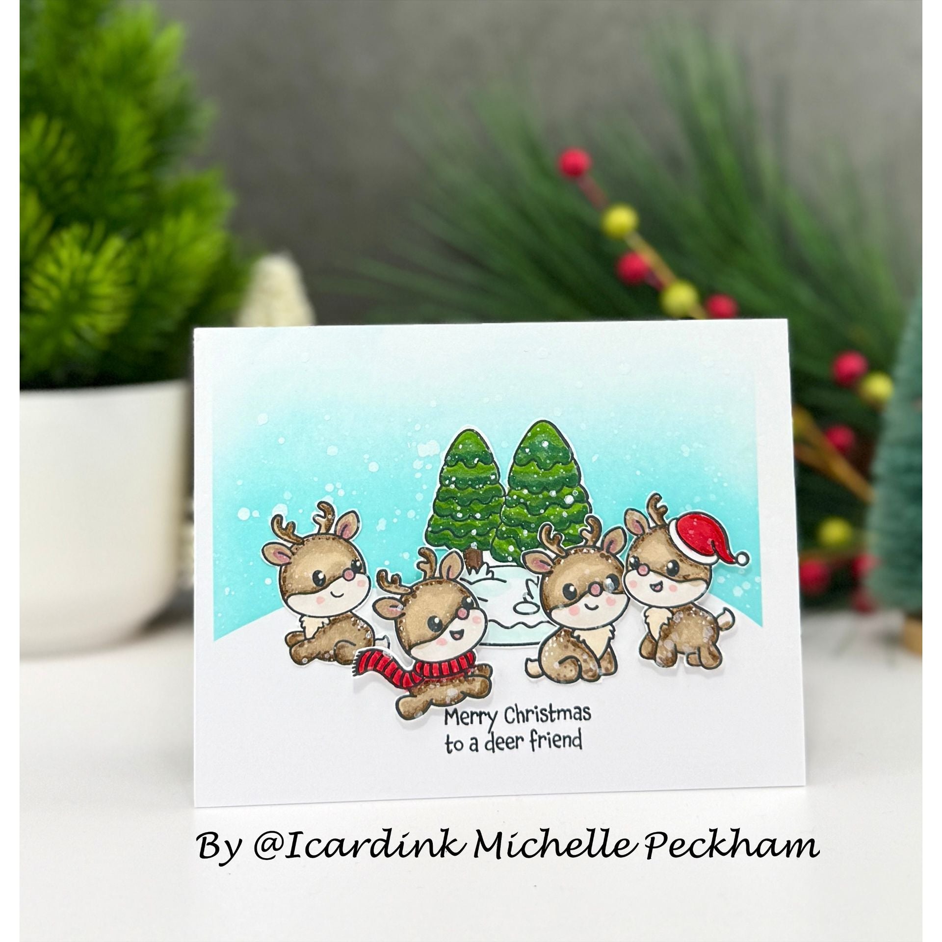 Add adorable woodland charm to your holiday crafting with the Simon Says Stamp Baby Fawn stamp set. This sweet collection features four baby reindeer—including one wrapped in a cozy scarf and another bundled up in a stocking cap—as well as a snowy tree cluster and delicate snowflakes.
