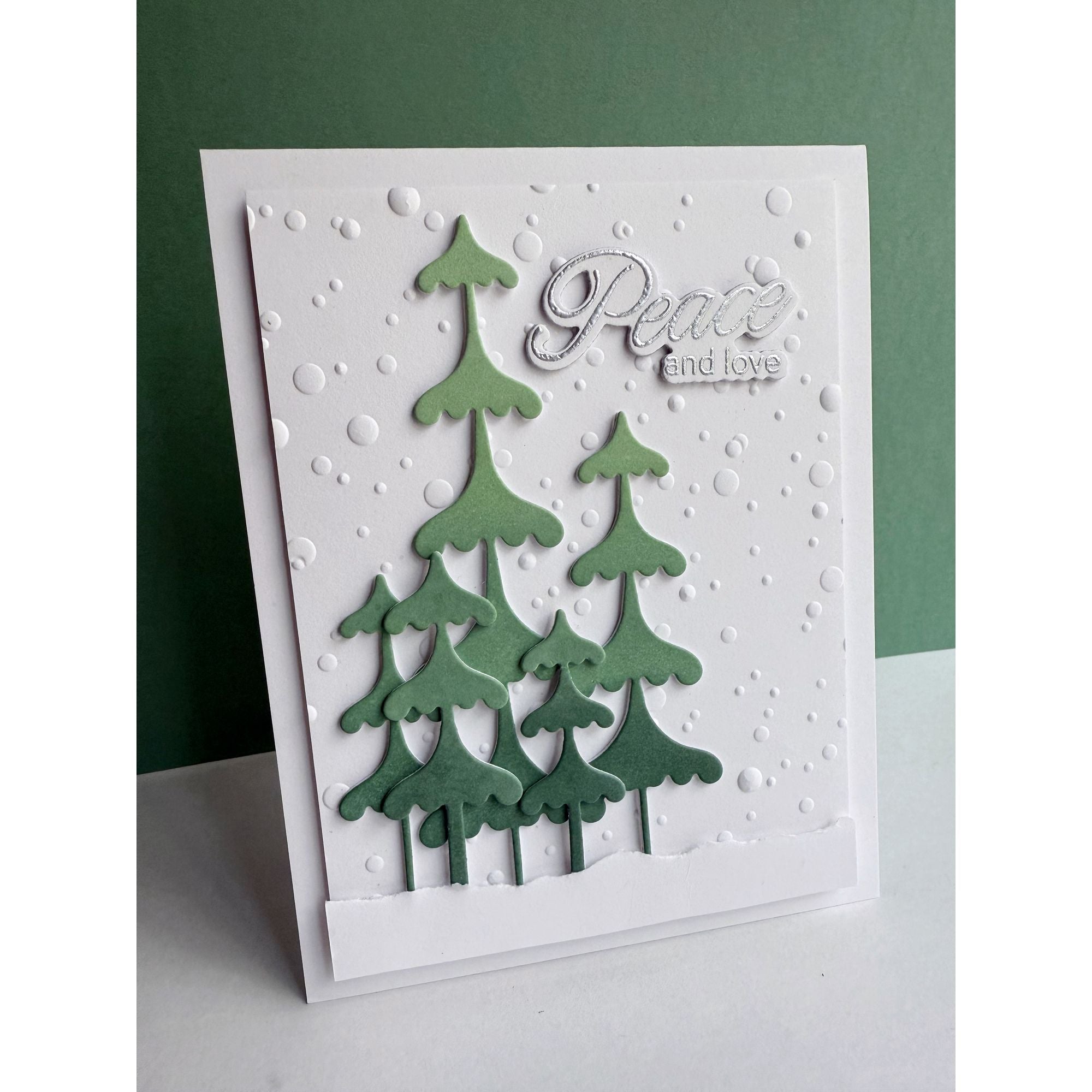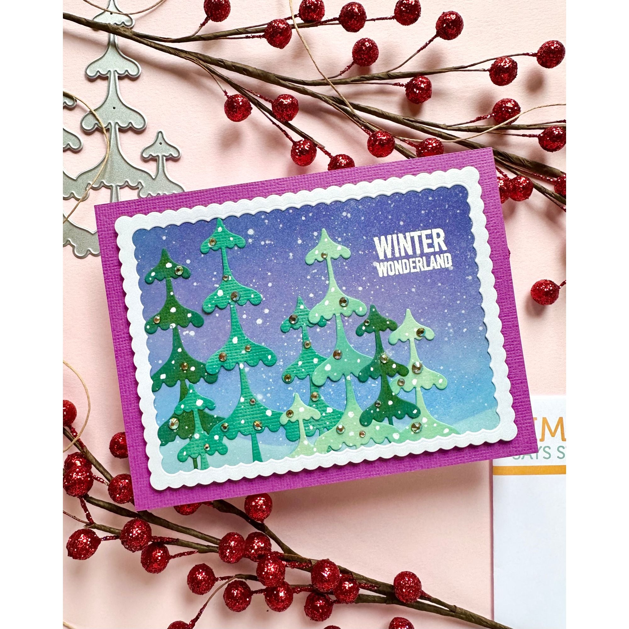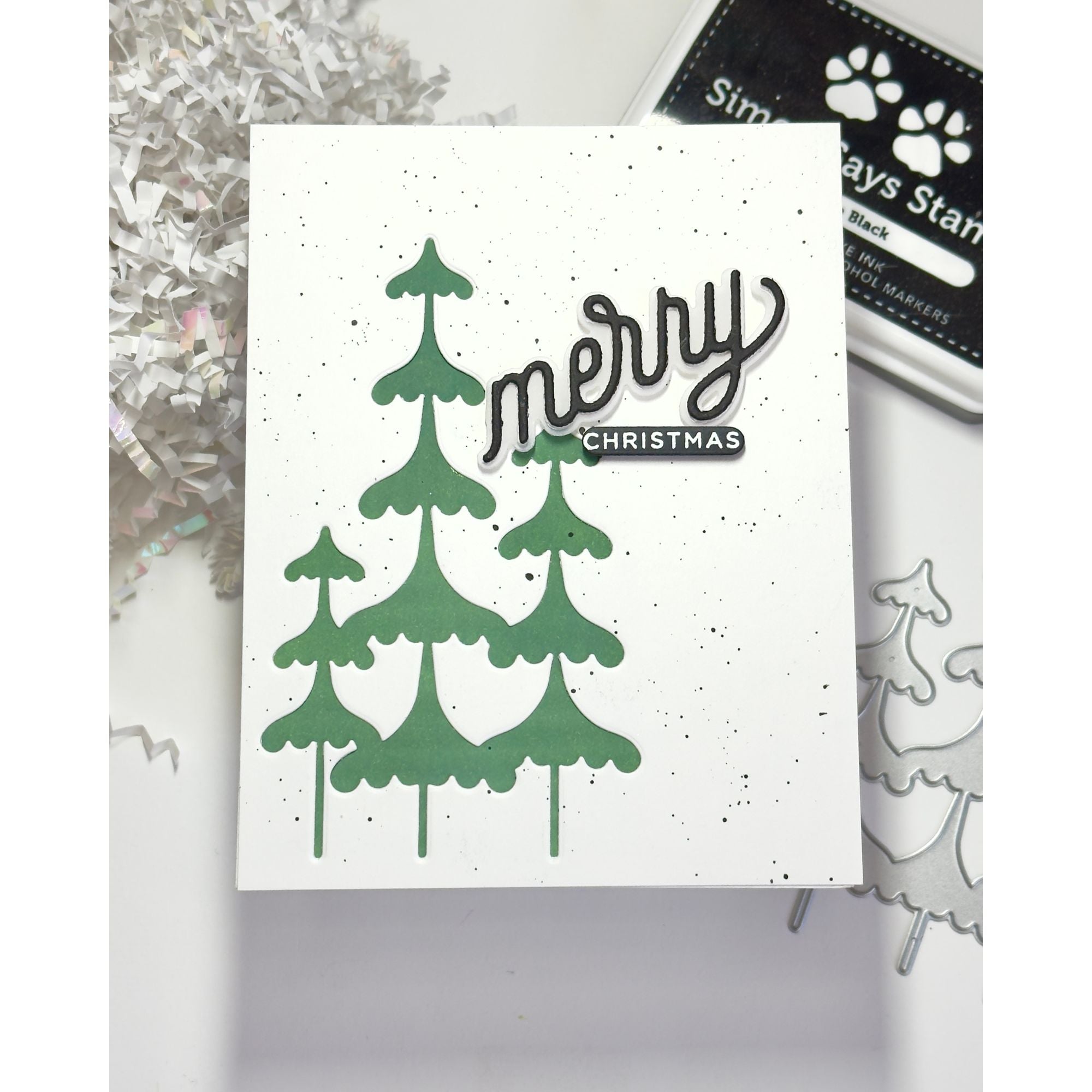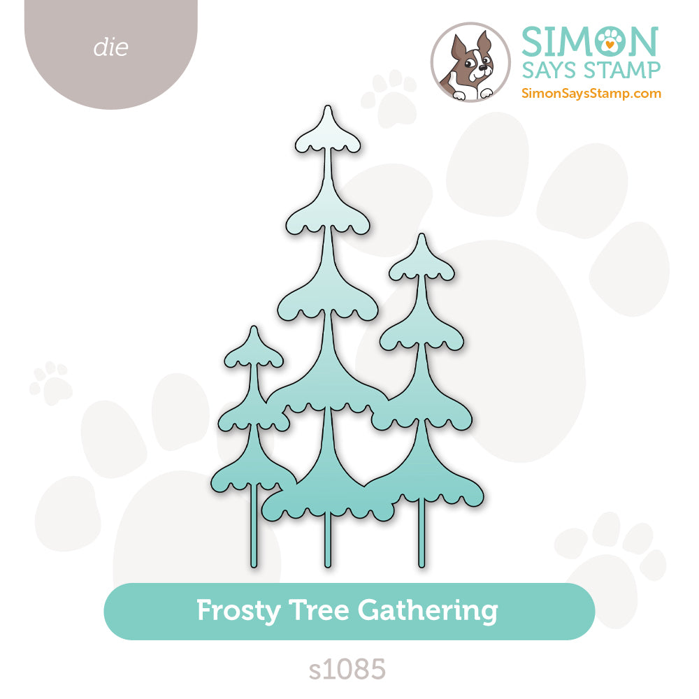 Create elegant winter landscapes with the Simon Says Stamp Frosty Tree Gathering die. This single die cuts a cluster of three tall, stylized trees, each composed of tiered sections that grow larger from top to bottom and vary in height for visual balance.