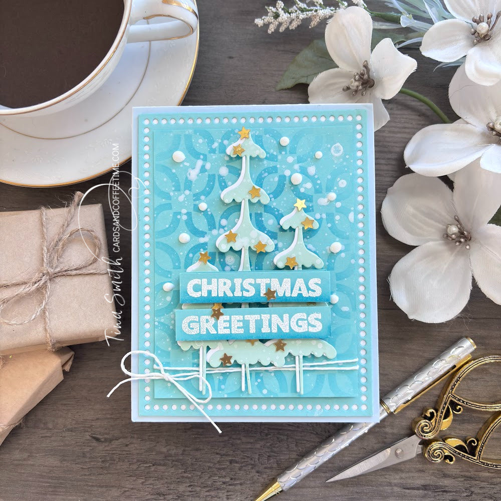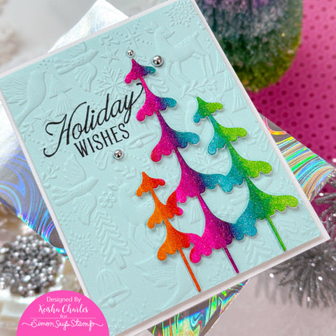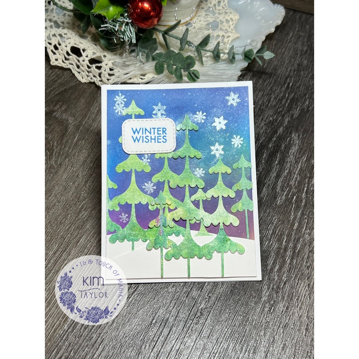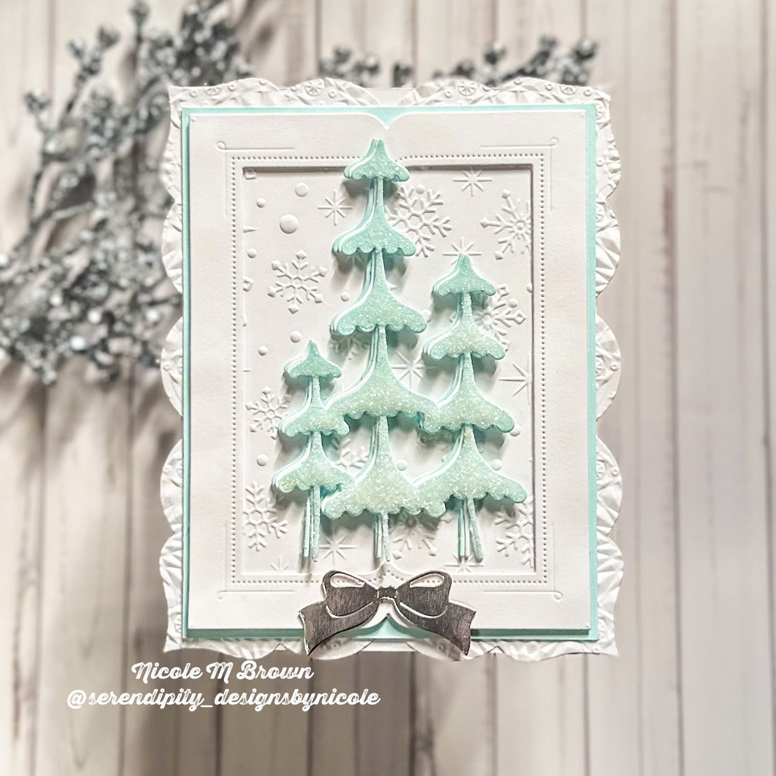 Create elegant winter landscapes with the Simon Says Stamp Frosty Tree Gathering die. This single die cuts a cluster of three tall, stylized trees, each composed of tiered sections that grow larger from top to bottom and vary in height for visual balance.