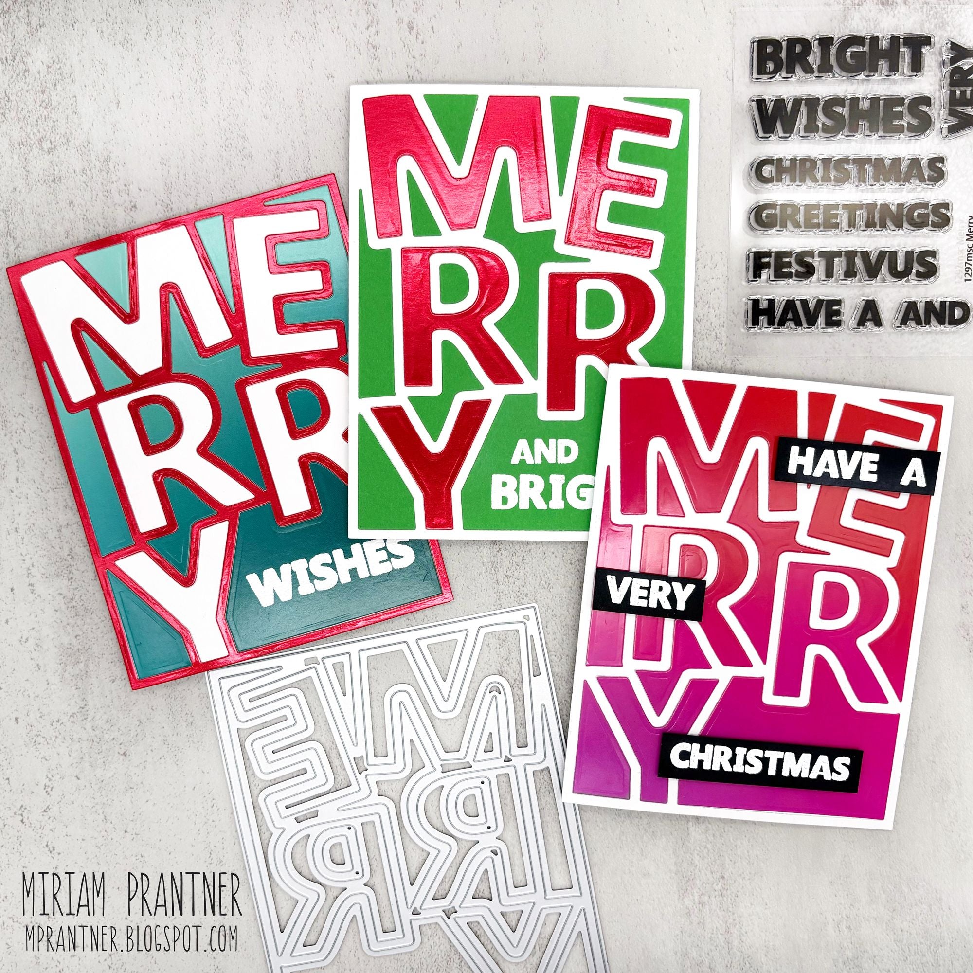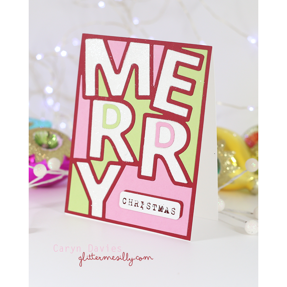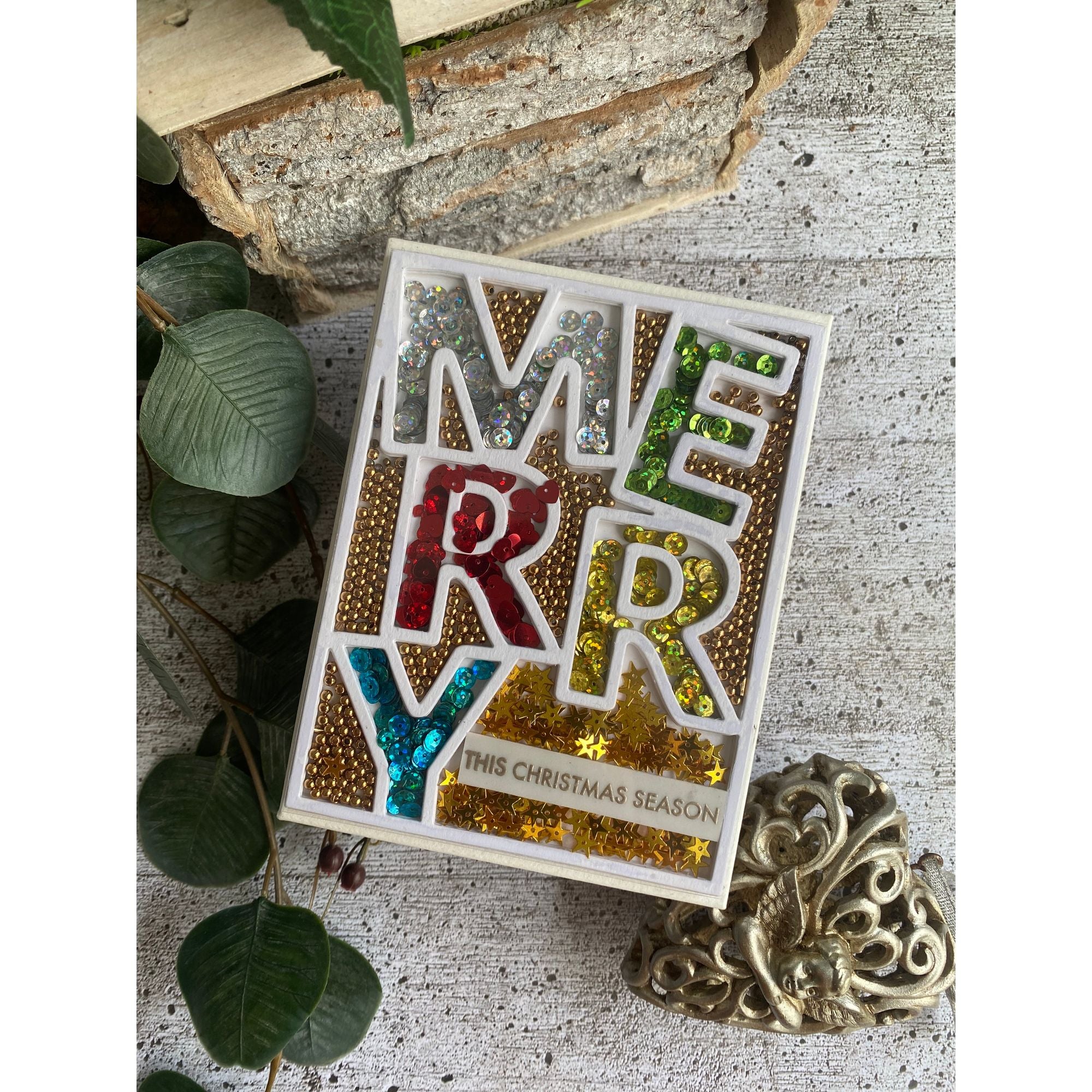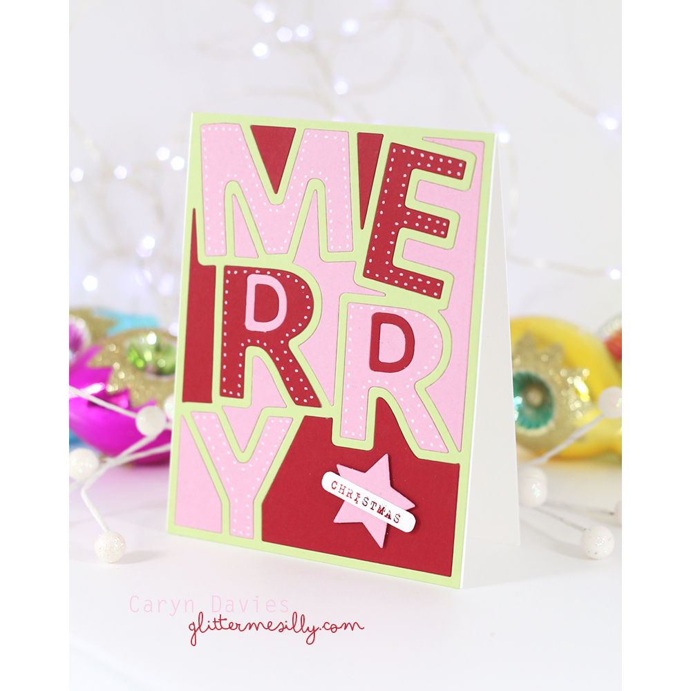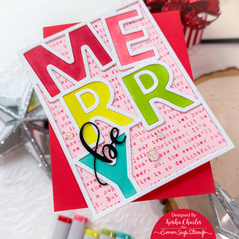 The Simon Says Stamp Merry Cover die cuts a bold, full-panel design featuring the word "MERRY" in large block letters that span most of the rectangle.