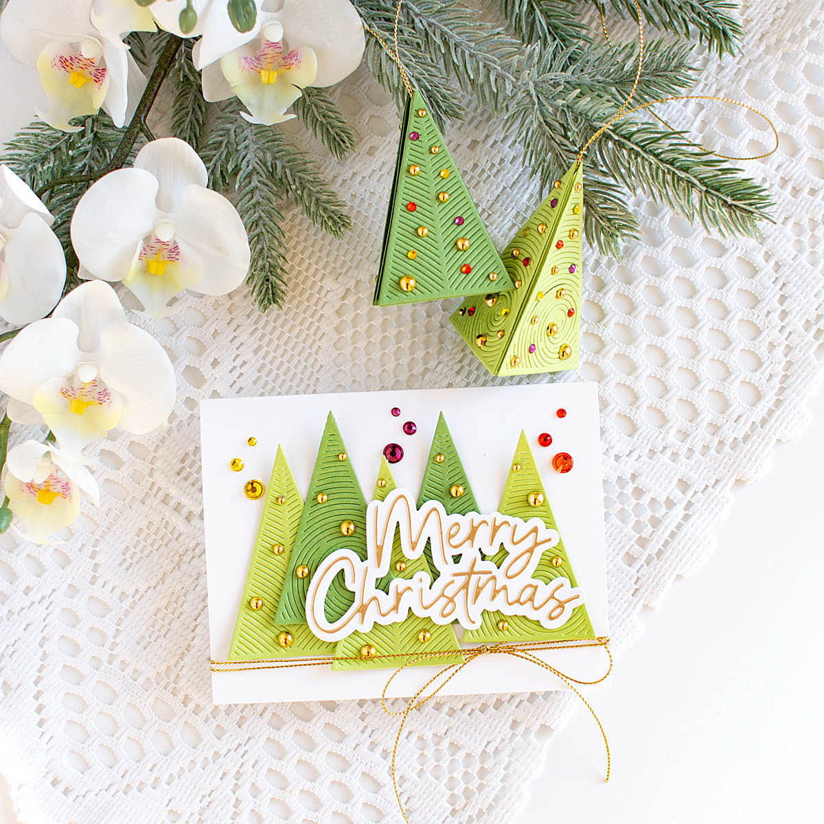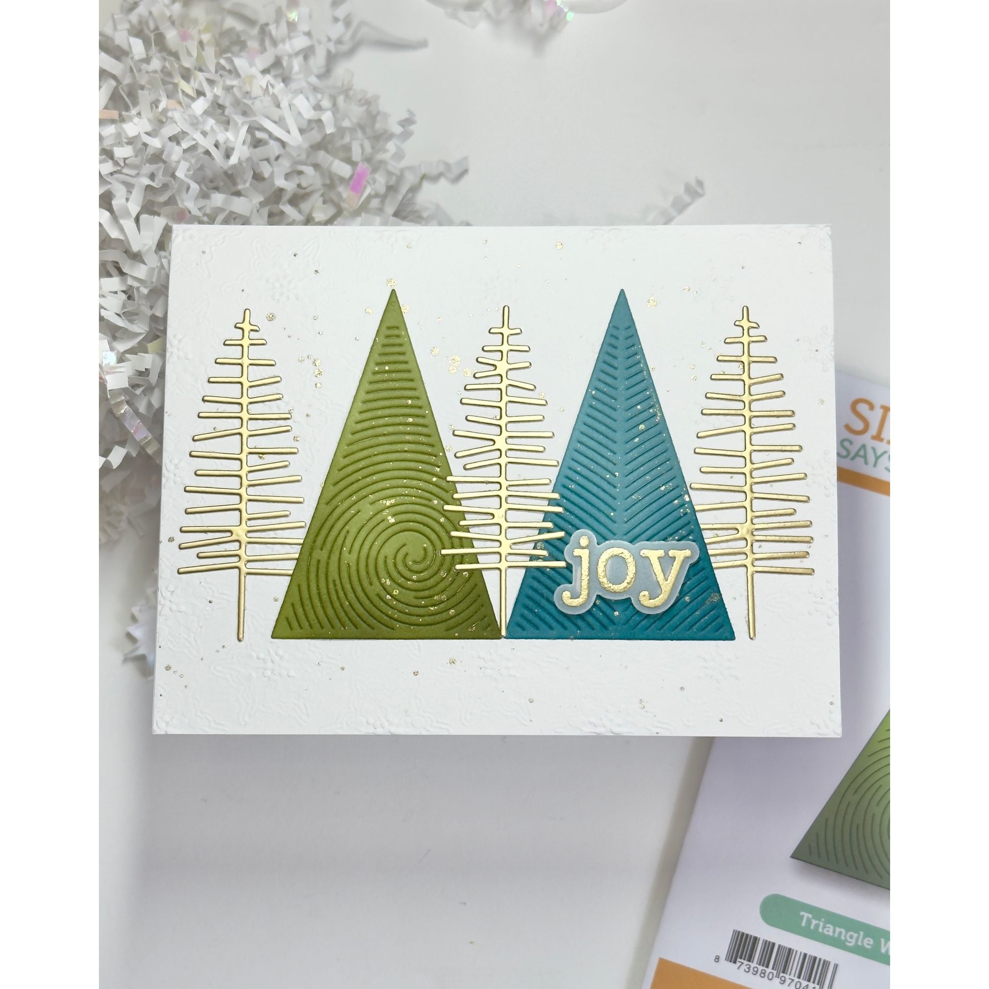 Add a touch of playful geometry to your crafting with the Simon Says Stamp Triangle Whirl Trees dies bundle. This clever design cuts two simplified, etched triangular trees—one with clean, upward-angled branches and the other with elegant swirling lines—as well as a triangle-shaped piece with a side tab that allows you to make them 3D.