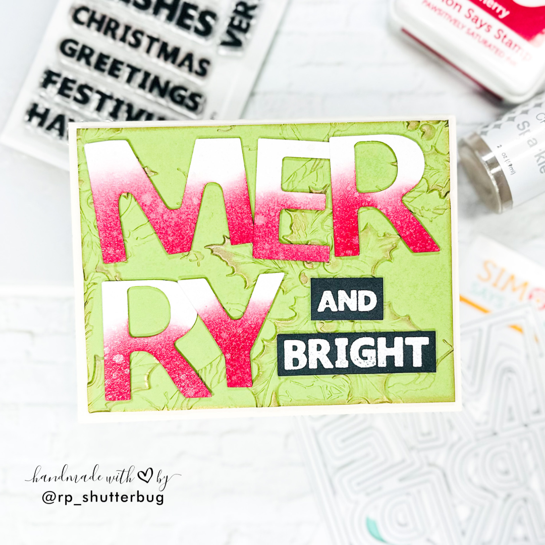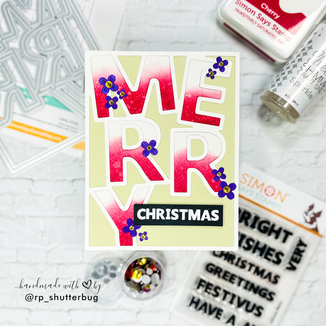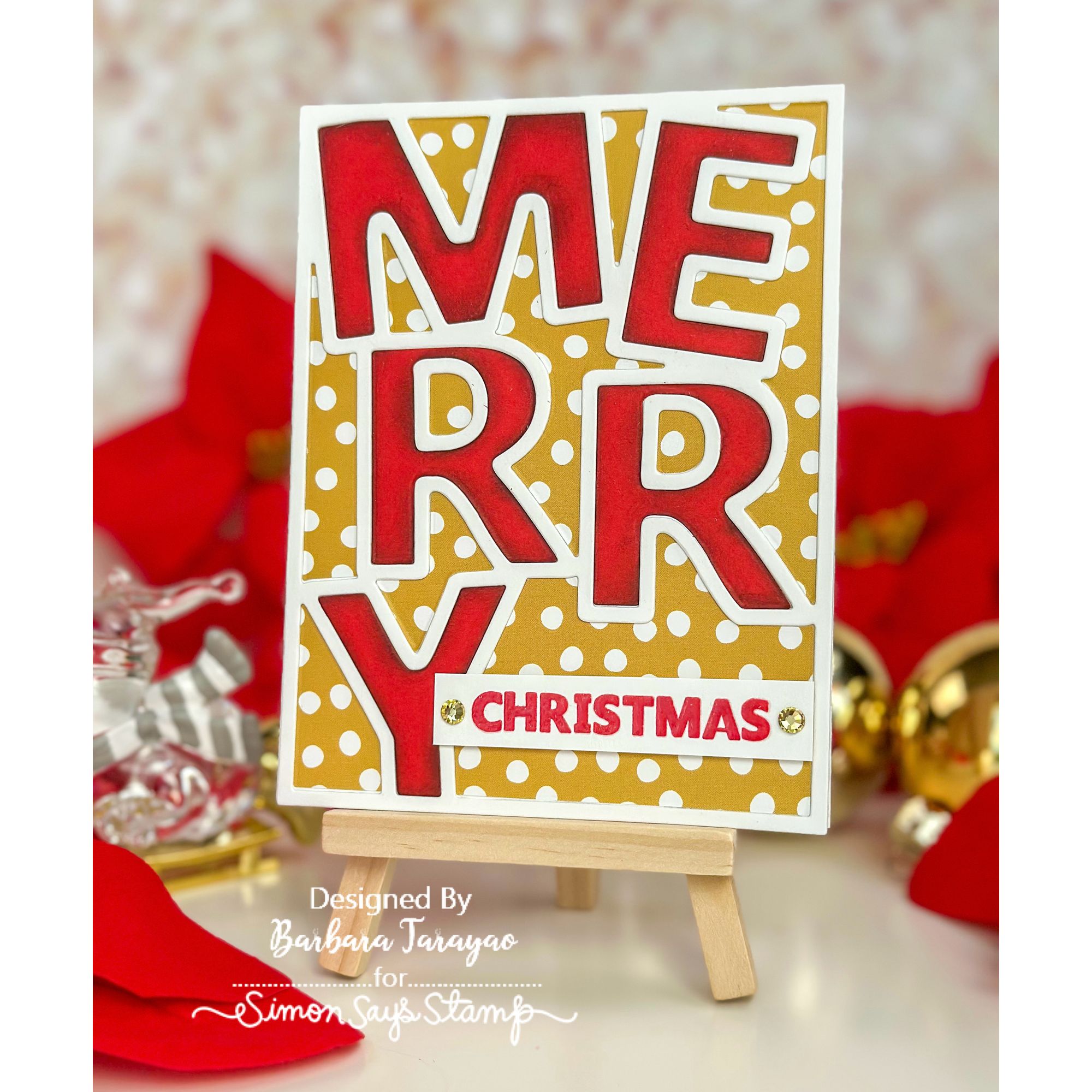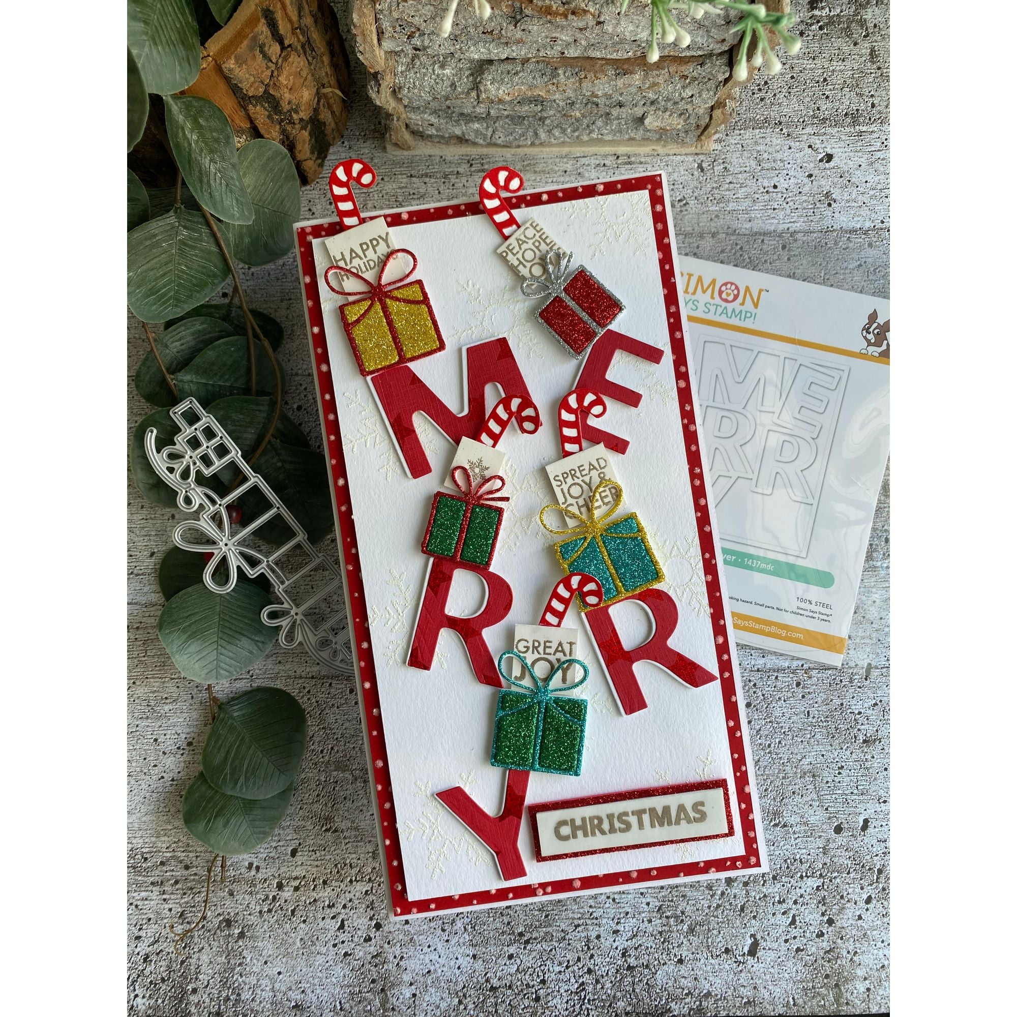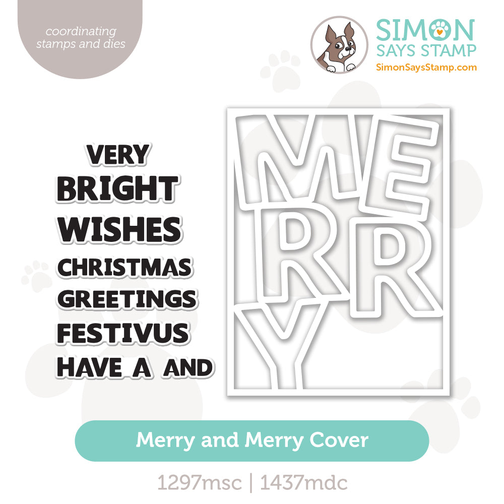 The Simon Says Stamp Merry Cover set cuts a bold, full-panel A2 design featuring the word "MERRY" in large block letters that span most of the rectangle. The stamps add sentiments designed to coordinate perfectly with the cover plate.