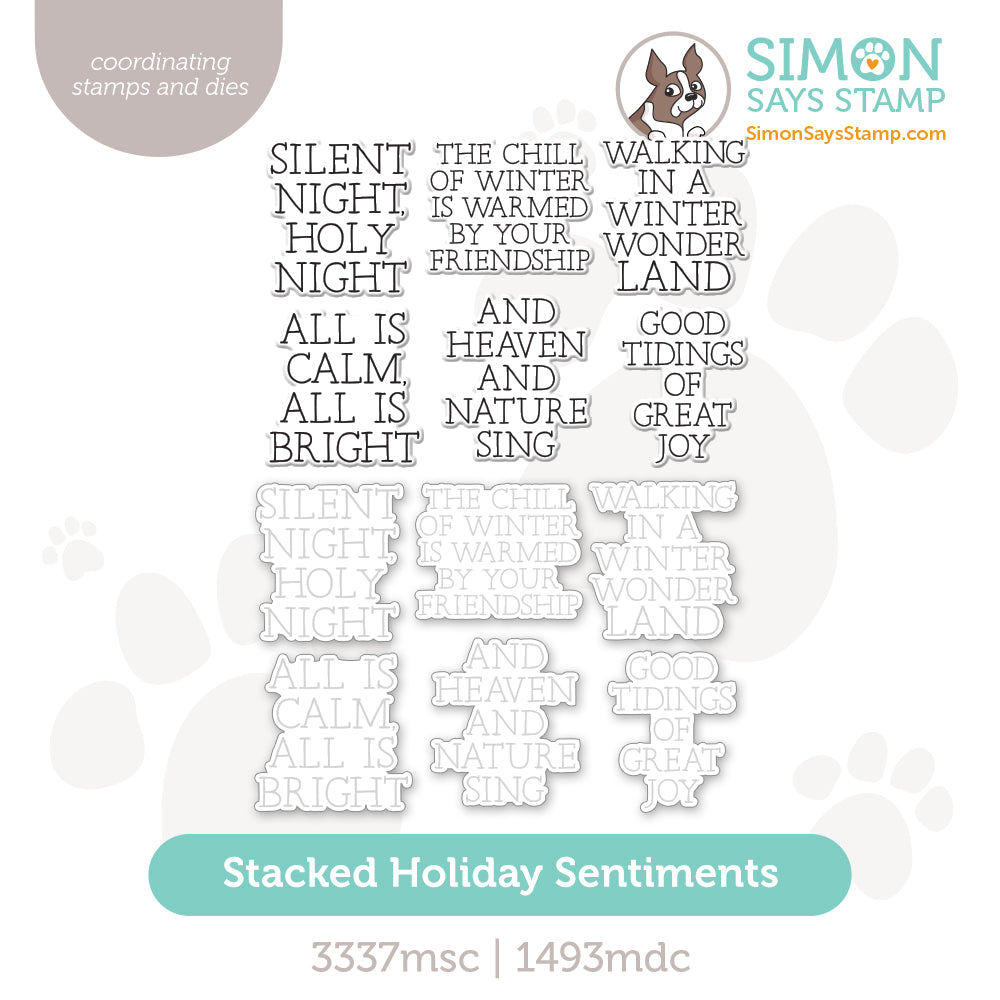 The Simon Says Stamp Stacked Holiday Sentiments stamp and die set is a timeless collection of holiday greetings designed in a clean, simple serif font.