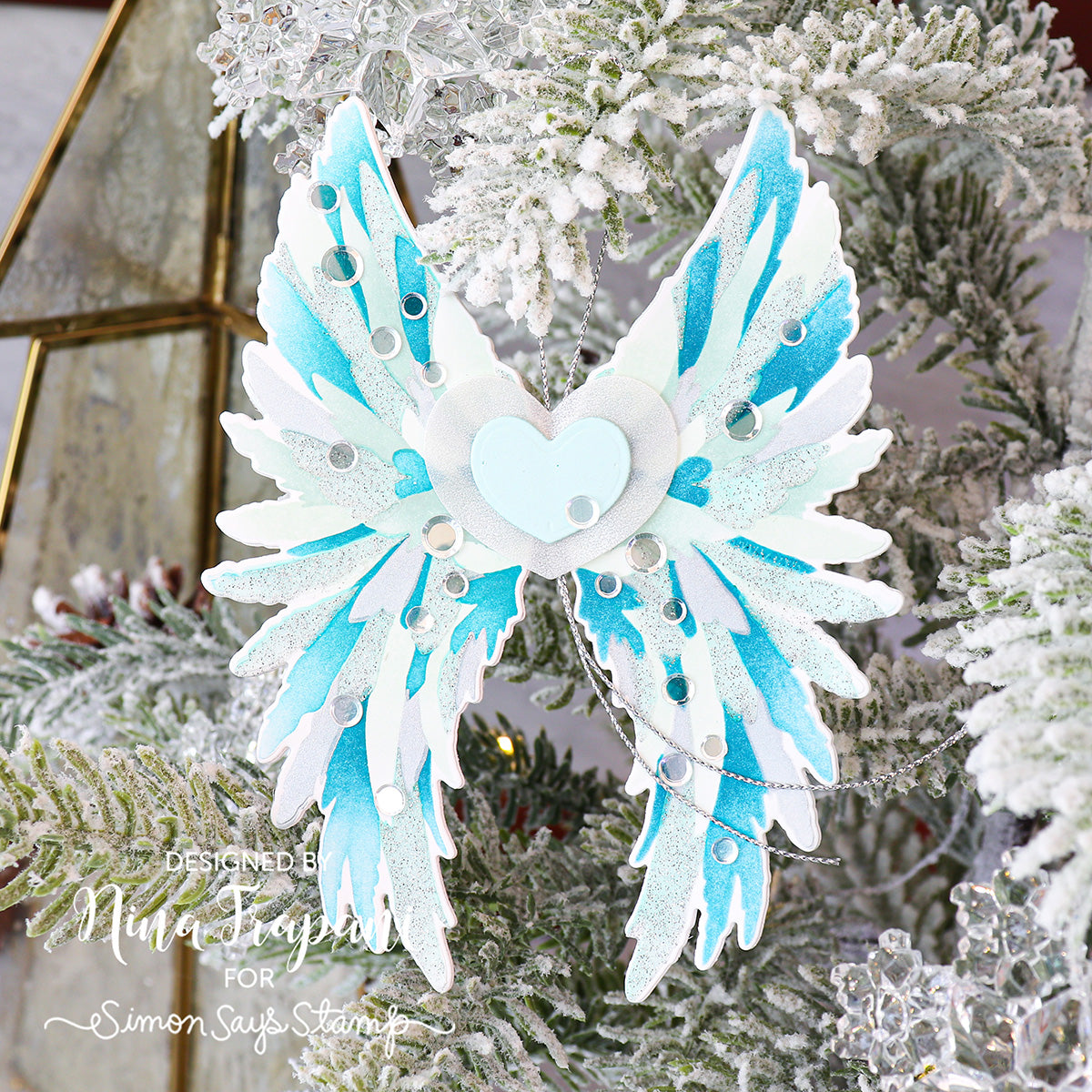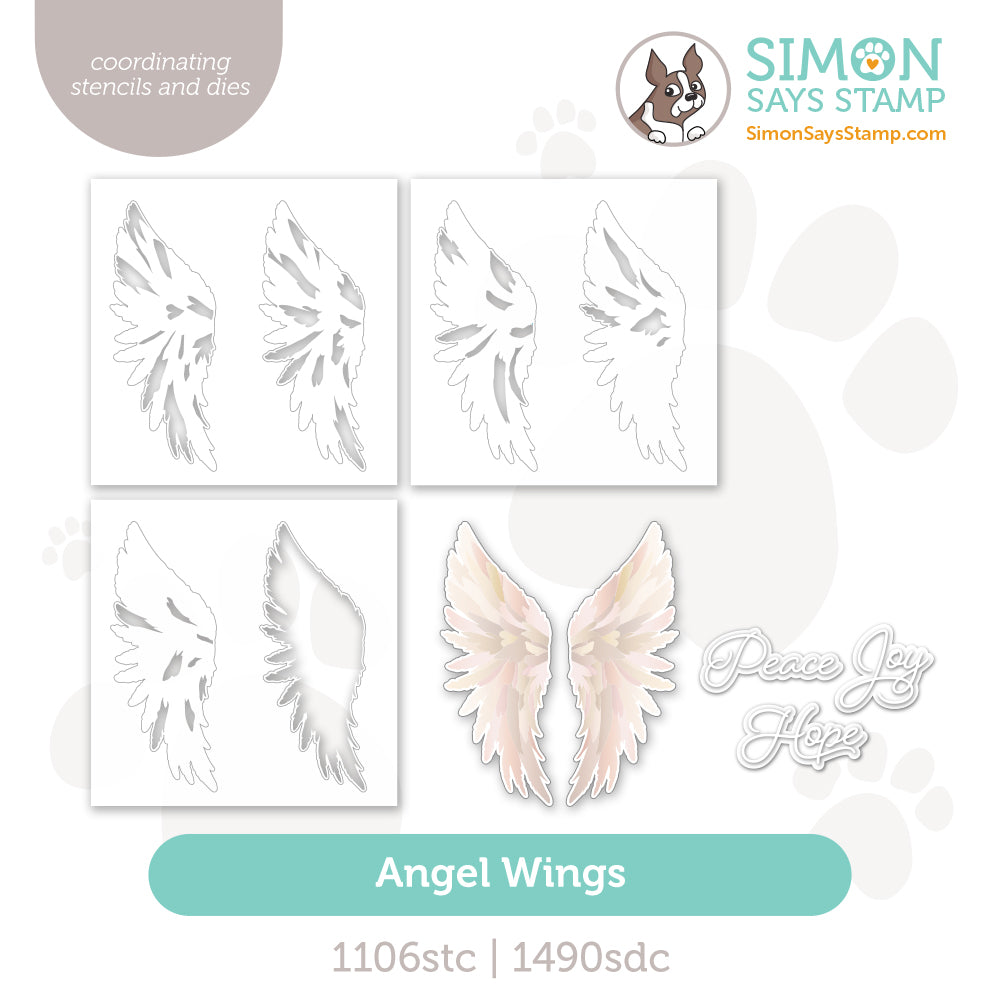 Create soft, graceful dimension with the Simon Says Stamp Angel Wings stencils and dies. The layering stencil set allows you to build beautiful, billowing wings—one layer at a time—for a fluffy, feathery effect that feels almost ethereal. There is a die to cut out the completed layered wings for added dimension and detail as well as three elegant sentiment dies—"Peace," "Joy," and "Hope"—each with both the word die and a coordinating outline shadow die.
