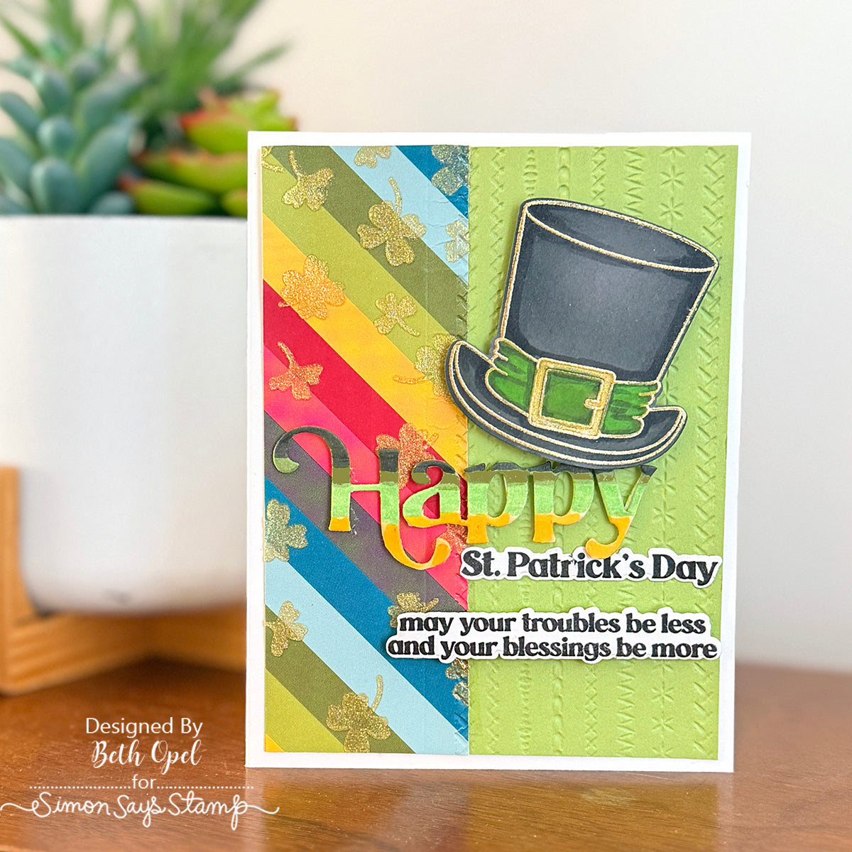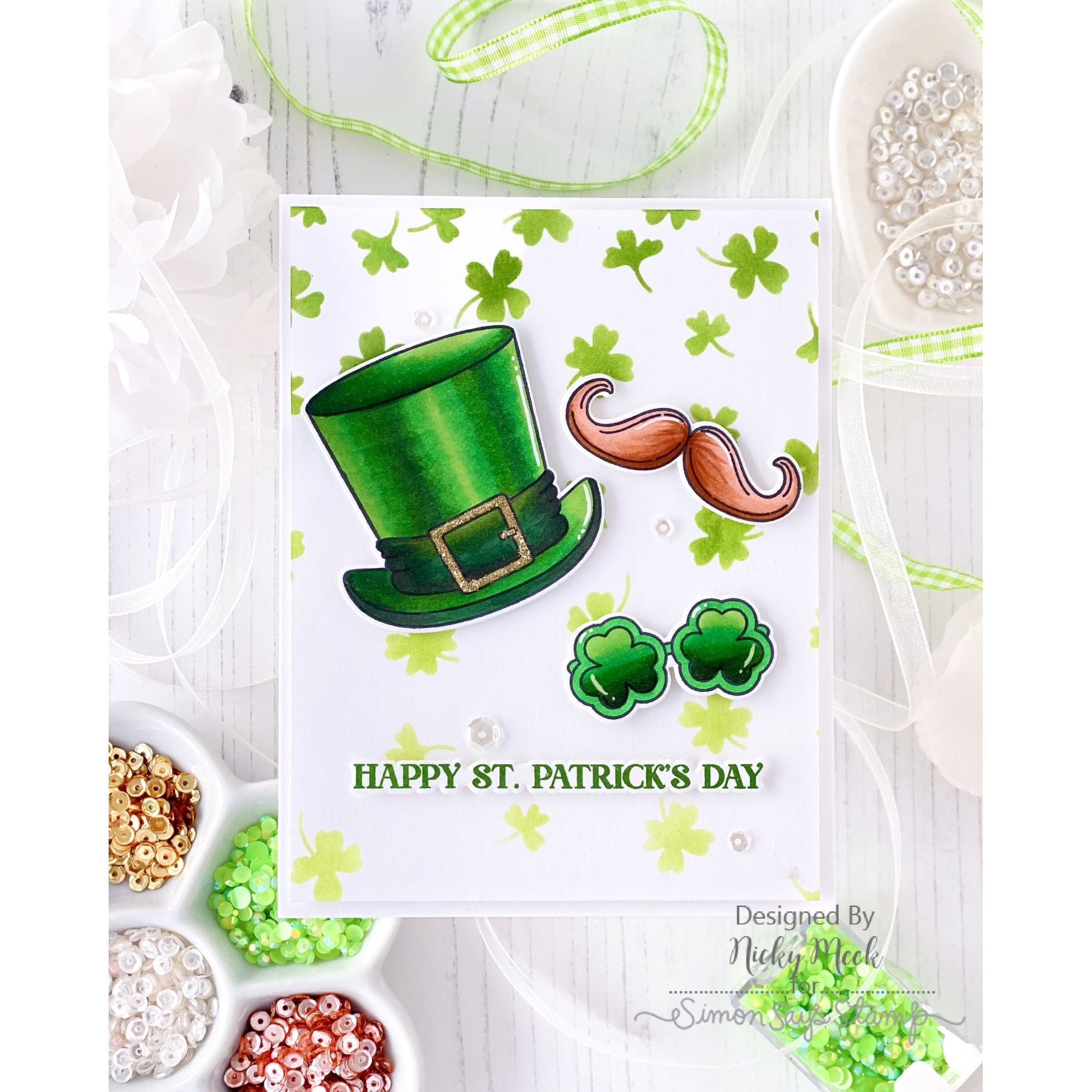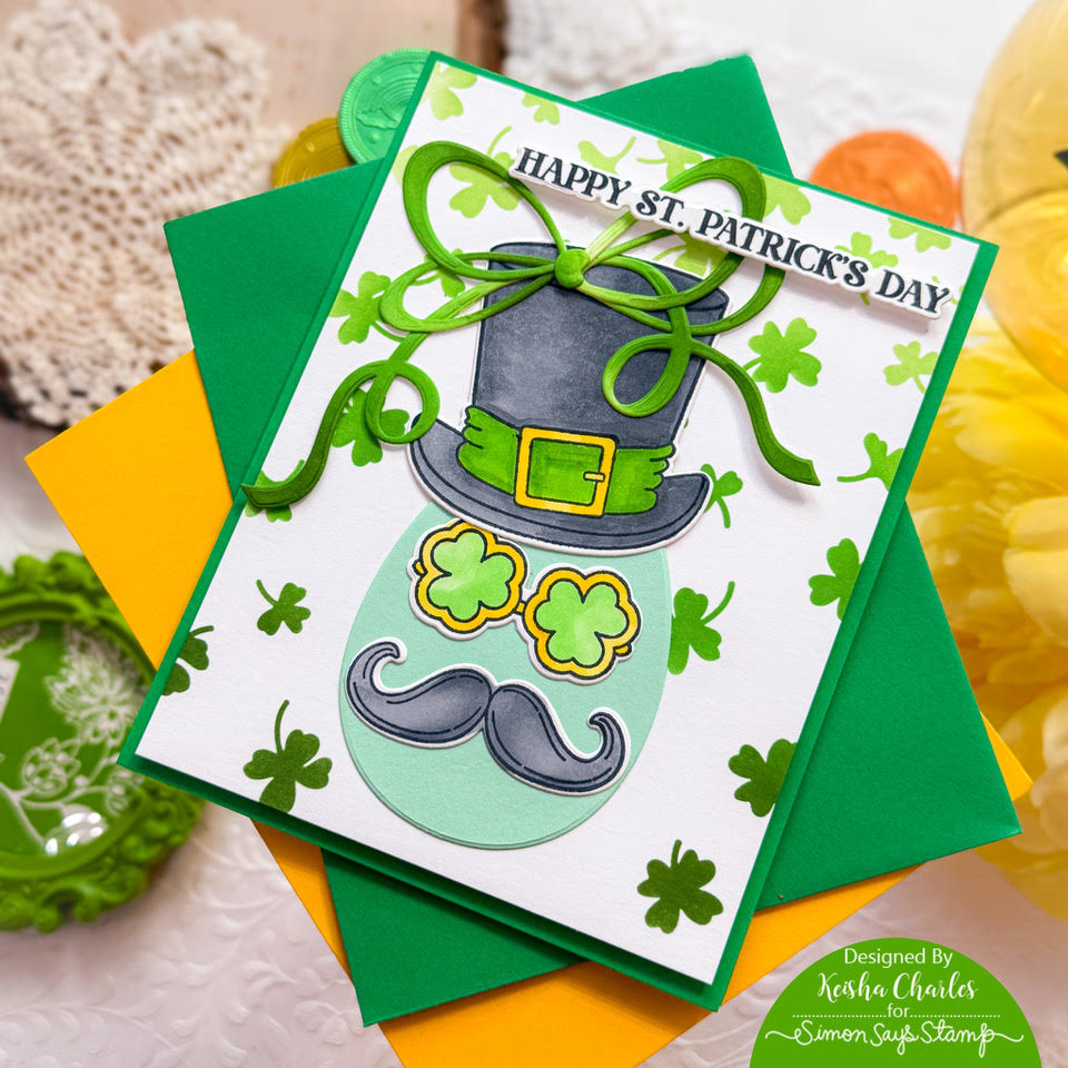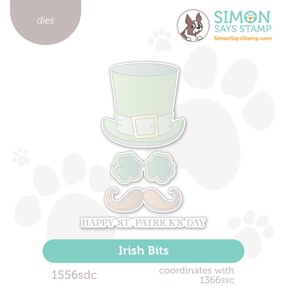The Simon Says Stamp Irish Bits dies perfectly complement the Irish Bits stamp set, cutting out the top hat, shamrock sunglasses, handlebar mustache, and the "Happy St. Patrick’s Day" sentiment with precision.