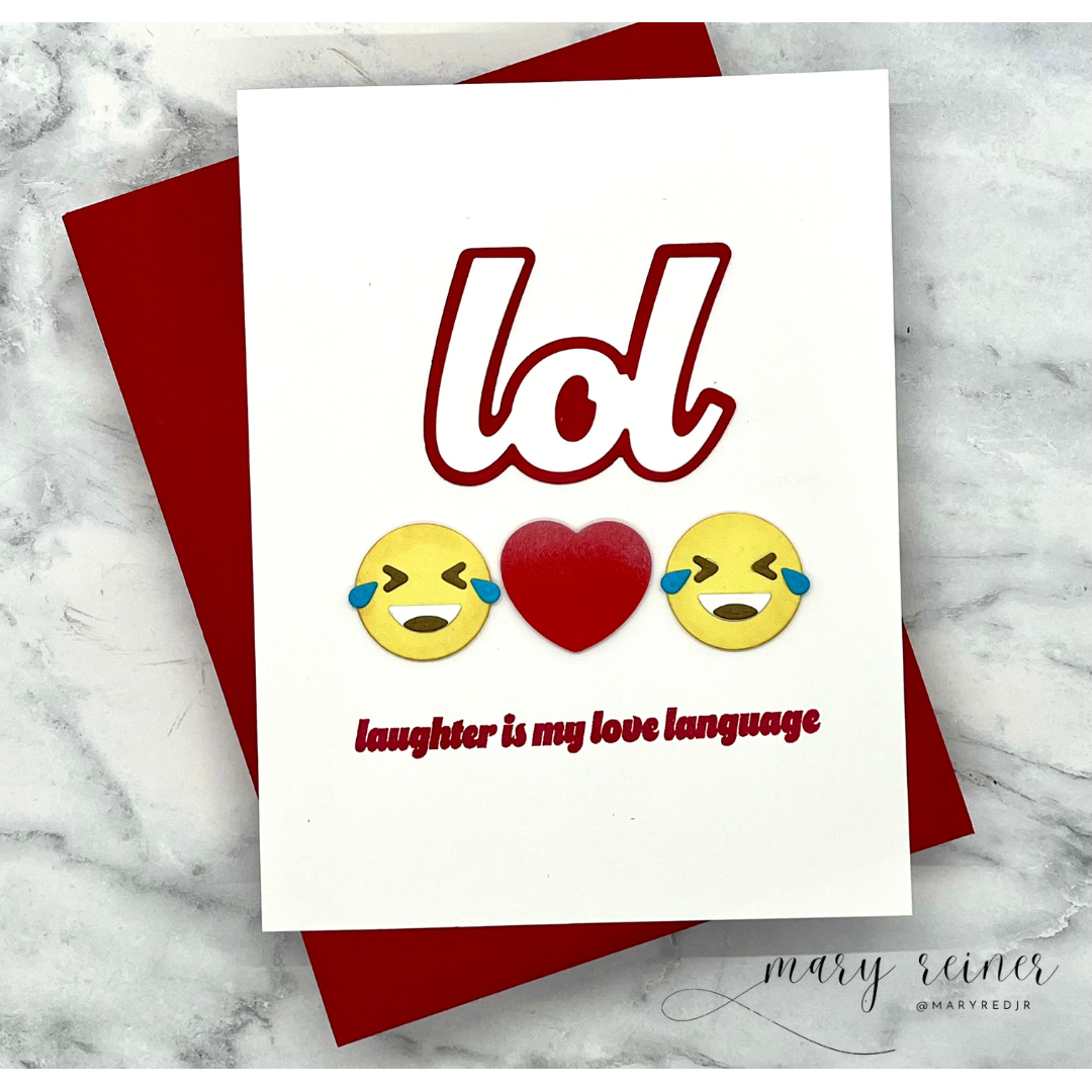 It also includes mid-sized sentiments, smaller sub-sentiment add-ons, and fun emoji-style faces and elements (laughing and crying laughing) to complete your message. The largest emoji is a layering stamp, so the alphanumeric indicators give you directions for the order in which you should stamp them.