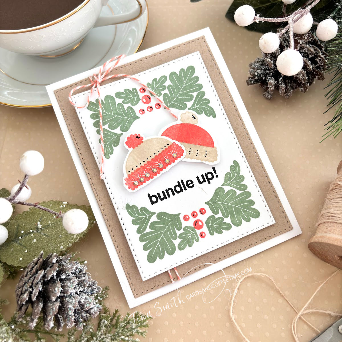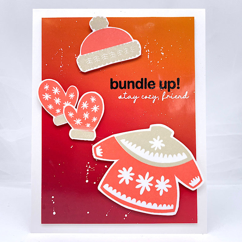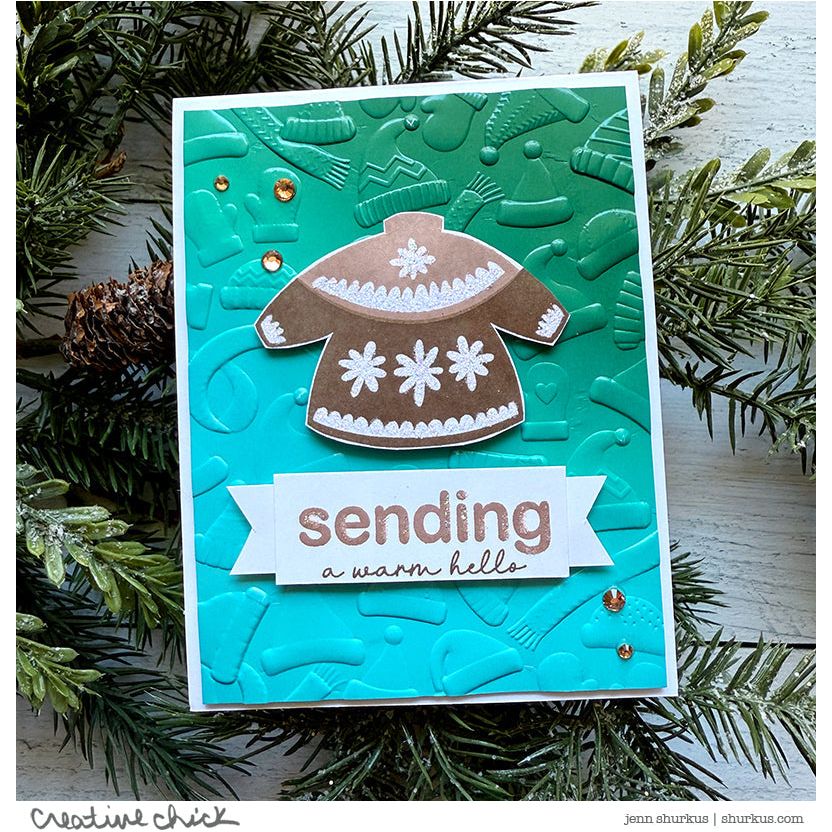 Featuring a folk art sweater, knit hat, mittens, ice skate, leafy borders, leaves, and berry branches, this set is perfect for adding warmth and style to your winter-themed cards and projects. Since it is a layering set, the alphanumeric indicators give you directions for which stamps coordinate together and the order in which you should stamp them. Cozy sentiments complete the set: