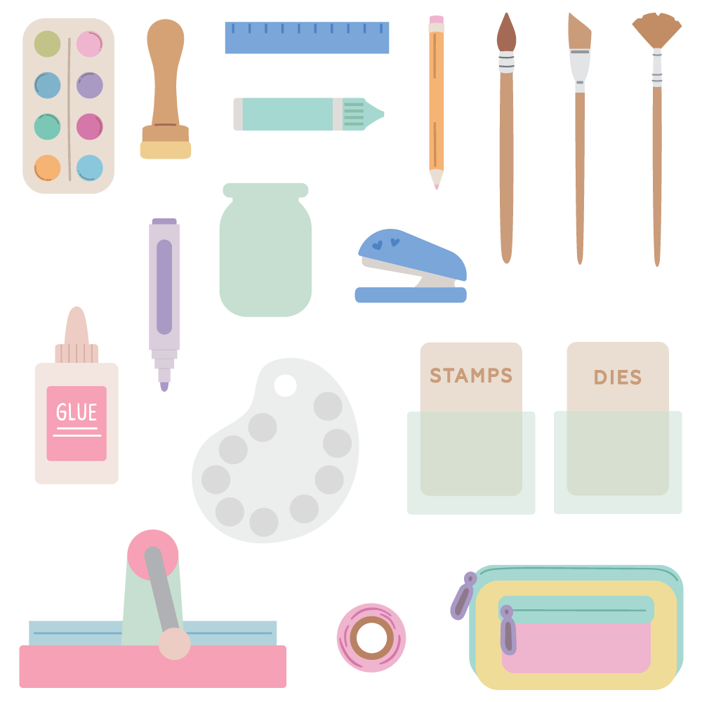Elevate your paper crafting with this exquisite set of 19 steel dies, designed for discerning crafters. Crafted from premium, durable steel and pre-clipped for ease, these dies deliver precise cuts compatible with most die-cutting machines. Perfectly complement your Lovely Layers Hoosier Cabinet, Craft Cart, or Desk and Pegboard to maintain an elegant and organized workspace. Featuring refined imagery such as paintbrushes, palettes, and washi tape rolls, these dies add a sophisticated touch to your handmade cards and embellishments. Experience the art of crafting with timeless quality and style.