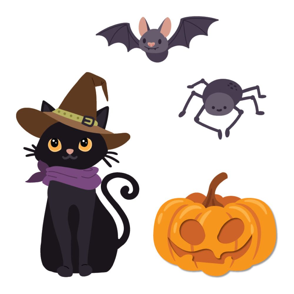 This set includes 18 dies for layering and can create a cat, jack-o-lantern, bat, and spider. The cutting lines are marked in dark gray, while the embossed details are highlighted in teal. Crafted from top-quality finished 100 percent steel, these dies are compatible with a wide range of die-cutting machines currently available on the market.
