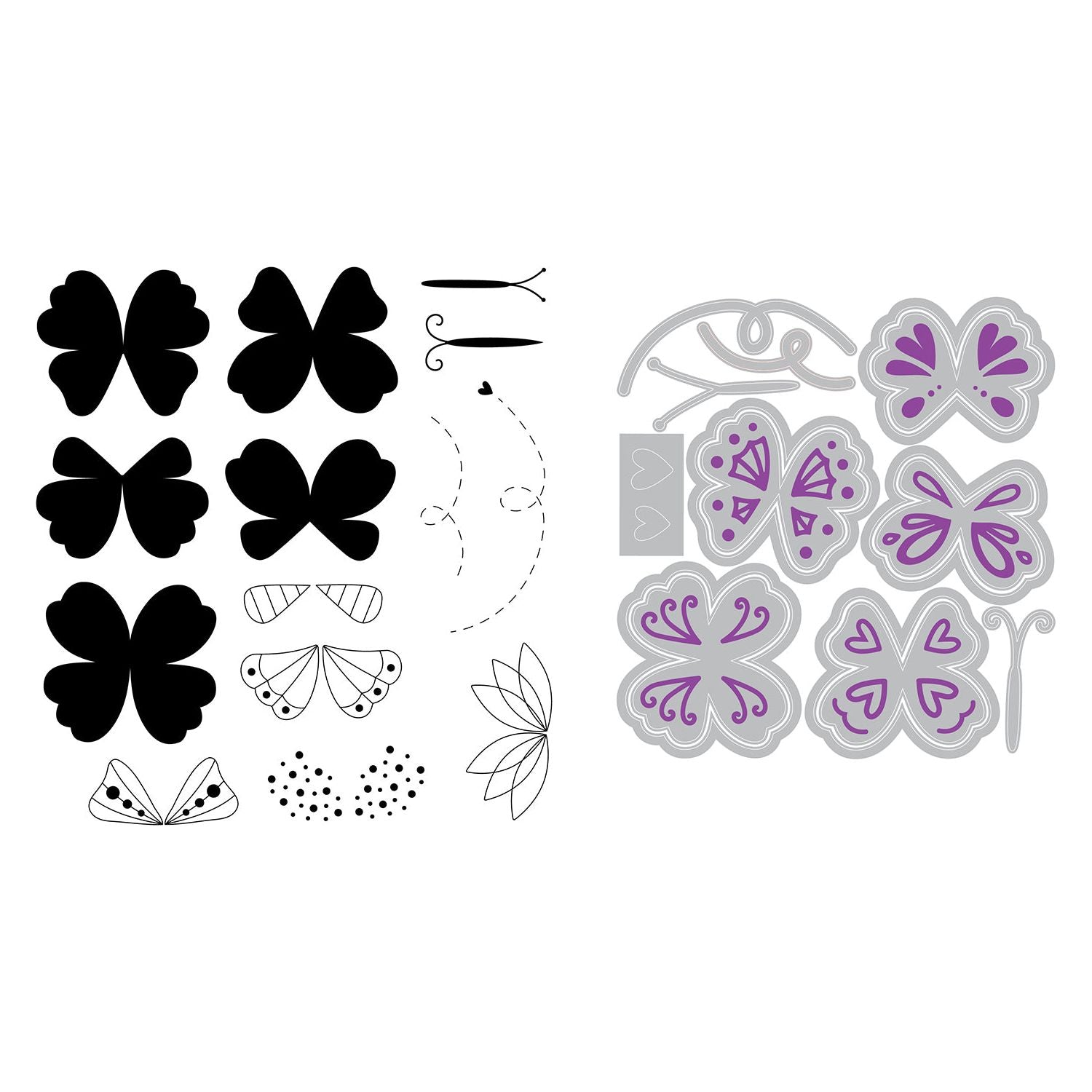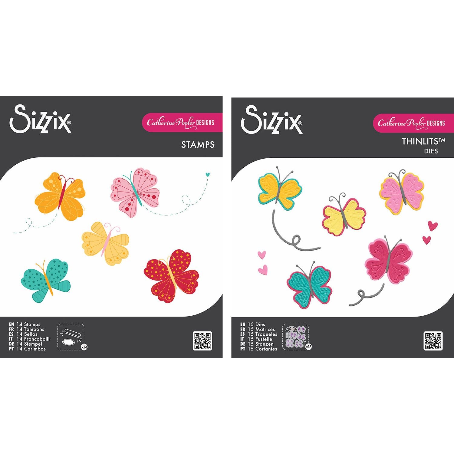 Sizzix Bright Butterflies Stamp and Die Bundle includes Butterflies 1 Clear Stamps Set 666992 and Butterflies 2 Framelits Dies 667007, both designed by Catherine Pooler. The 14-piece stamp set features whimsical butterflies with a variety of wing patterns and dotted lines for playful flight trails, with stamp sizes ranging from approximately 1.625 x 1.5 to 1.125 x 0.375 inches. The coordinating die set includes 15 wafer-thin dies featuring butterfly shapes, wing details, hearts, and loopy trails, ranging from approximately 1.625 x 1.625 to 0.5 x 1 inches. Use them individually or together to effortlessly cut out stamped images and bring your butterfly creations to life.