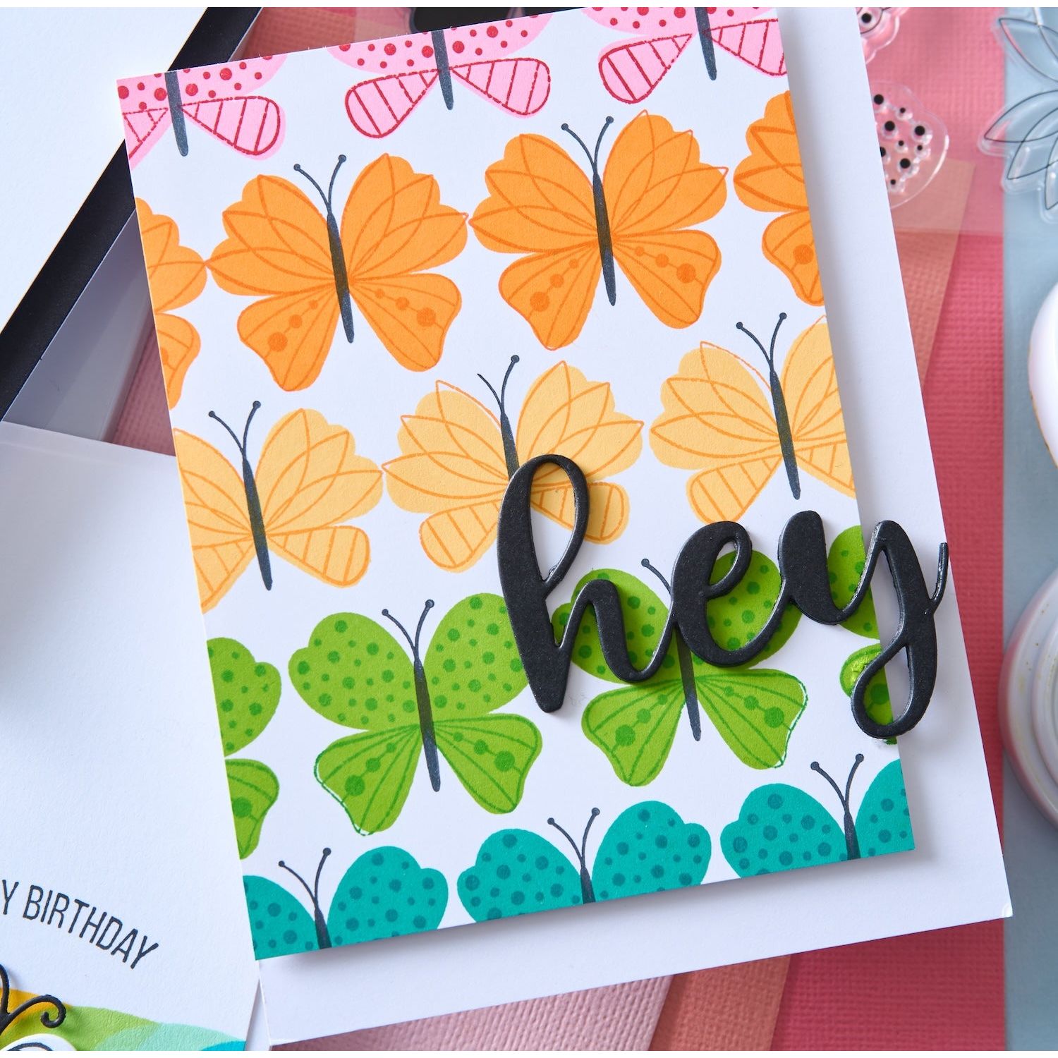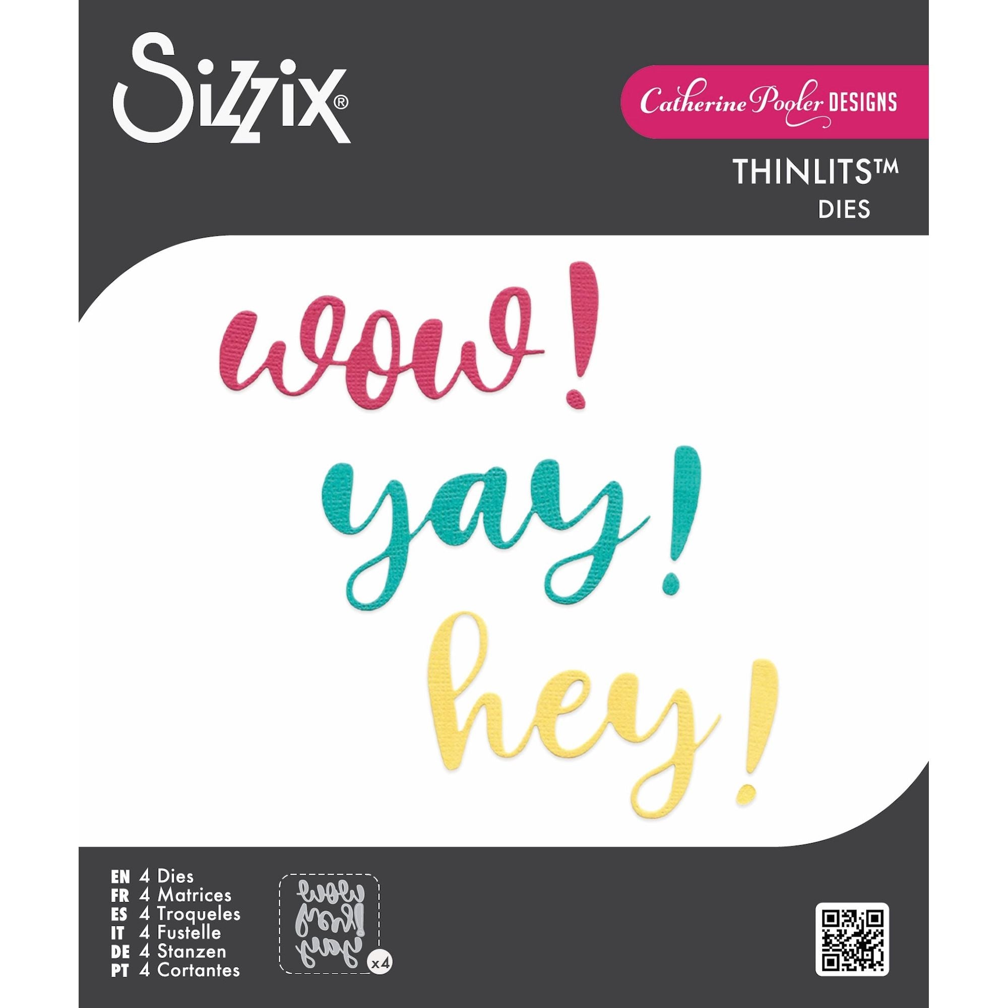 Sizzix Exclamation Word Thinlits Dies were designed by Catherine Pooler. This set includes three dynamic word dies—"Wow," "Yay," and "Hey"—along with an exclamation point, perfect for adding bold, celebratory accents to cards, scrapbooks, tags, and more. Die sizes range from approximately 2.875 x 1 to 0.5 x 1.5 inches. These wafer-thin dies are compatible with most die-cutting machines, including the Sizzix Sidekick.