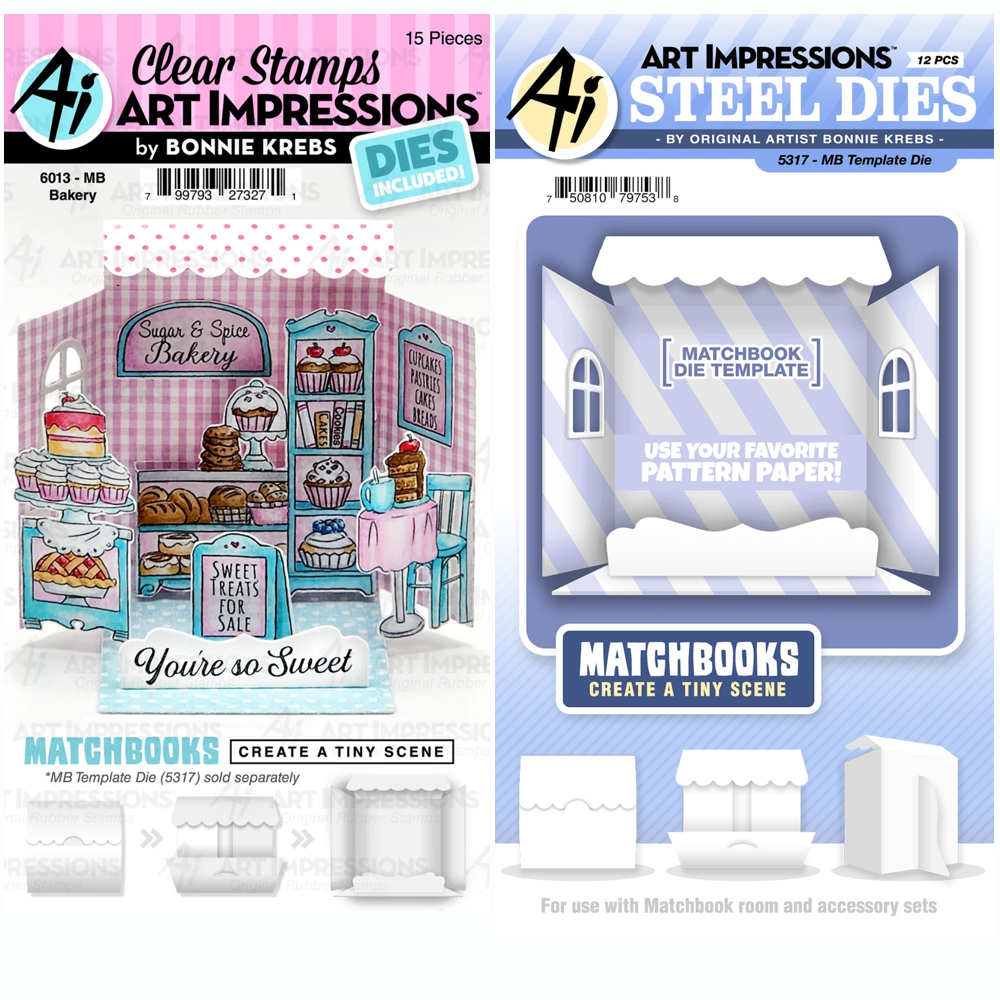 Add charm and whimsy to your crafting with the Art Impressions Bakery and Template Matchbooks Stamp and Dies Bundle! This set includes a bakery sign, menu, sandwich board, table and chair, cookbooks, and lots of sweet treats including cakes, cupcakes, cookies, bread, pie, and more in pretty display pieces, and more to create an adorable matchbook design. Stamp measures approximately 4x4 inches and finished matchbook stands open at 2.5 x 2.5 inches. Bring some gnome sweetness to your projects today! 'You're So Sweet', 'Love to Bake', and 'Roll with It.' sentiments included as well as select coordinating dies.