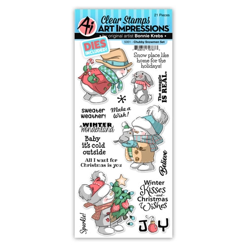 This set may feature chilly, chubby snowmen, but their hearts are warm! Our Chubby Snowmen set includes 5 stamped images with corresponding dies, the largest of which measures 2.25 inch square, and 10 sentiments. Images are three separate chubby snowmen, holding a candy cane, snuggling a bird, and wrapping a Christmas tree in their arms. This also includes a darling rabbit and hexagonal snowflake. Sentiments include Snow place like home for the holidays!, The snuggle is real., Make a wish!, Sweater Weather, Winter Wonderland, Baby it’s cold outside, All I want for Christmas is you, Believe, “Winter Kisses and Christmas Wishes, Sparkle! and Joy. Overall set is approximately 4x8 inches.