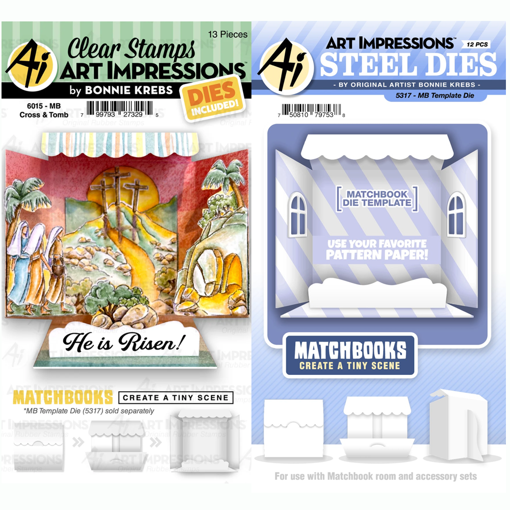 Create a gorgeous 3D scene to commemorate a holy occasion in your crafting with the Art Impressions Cross and Tomb and Template Matchbooks Stamp and Dies Bundle! This set includes a trio of crosses atop a hill at sunrise, a scene of a lit empty tomb, and a trio of people journeying to the scene as well as landscaping accessories, and more to create an adorable matchbook design. Stamp measures approximately 4 x 4 inches and finished matchbook stands open at 2.5 x 2.5 inches. Bring some gnome sweetness to your projects today! 'He is Risen!', 'Happy Easter', and 'He Lives!' sentiments included as well as select coordinating dies.