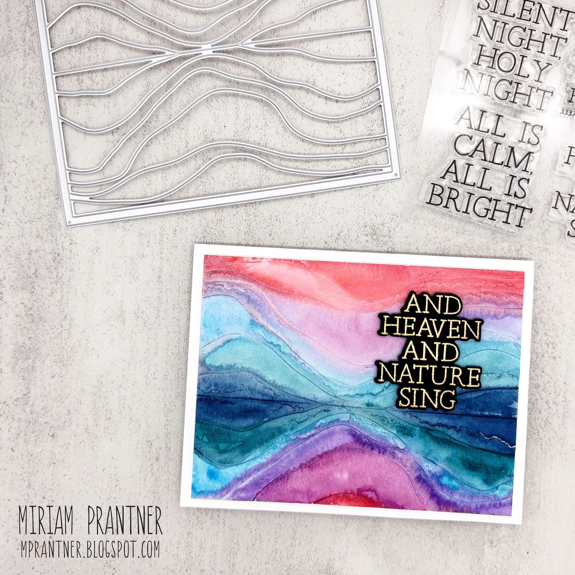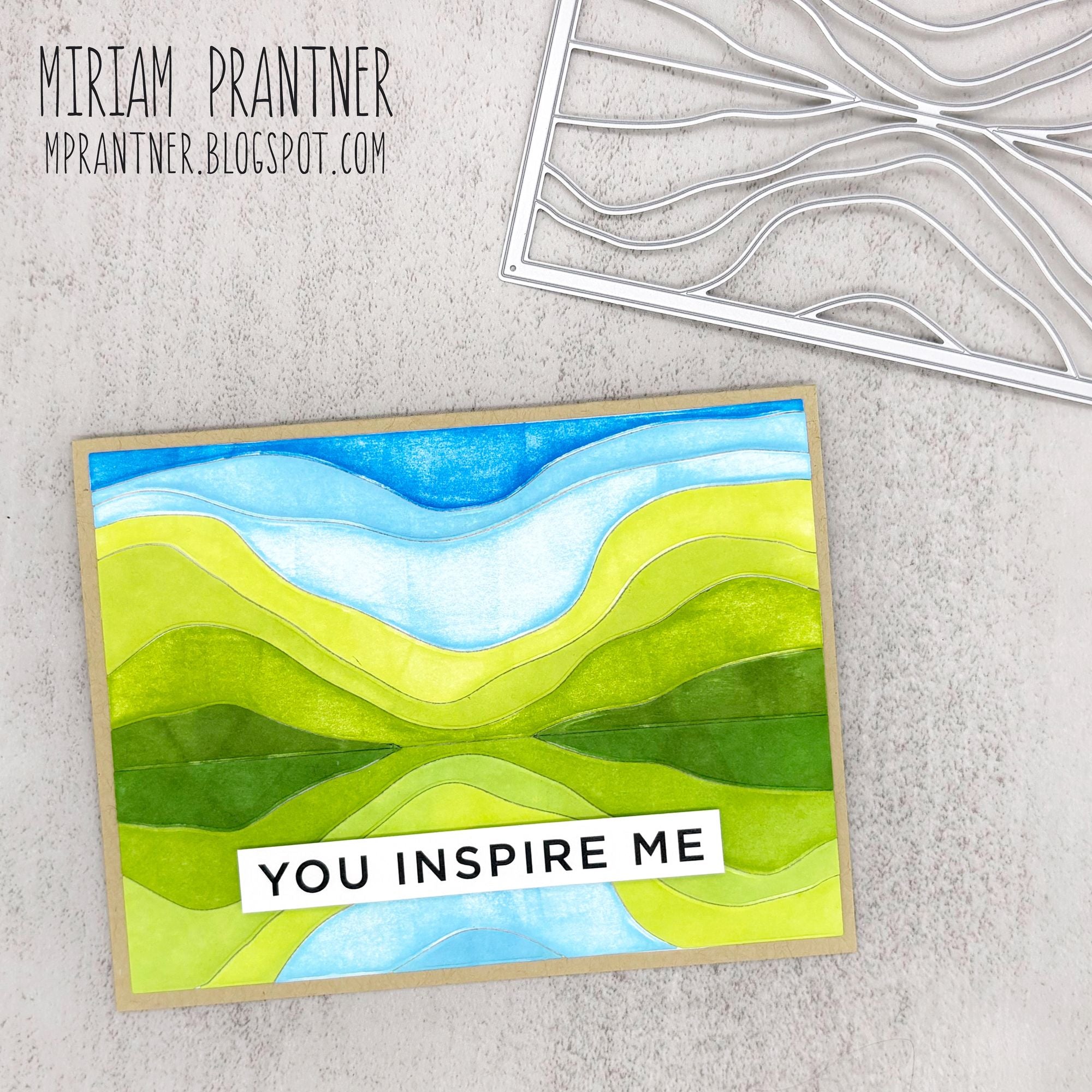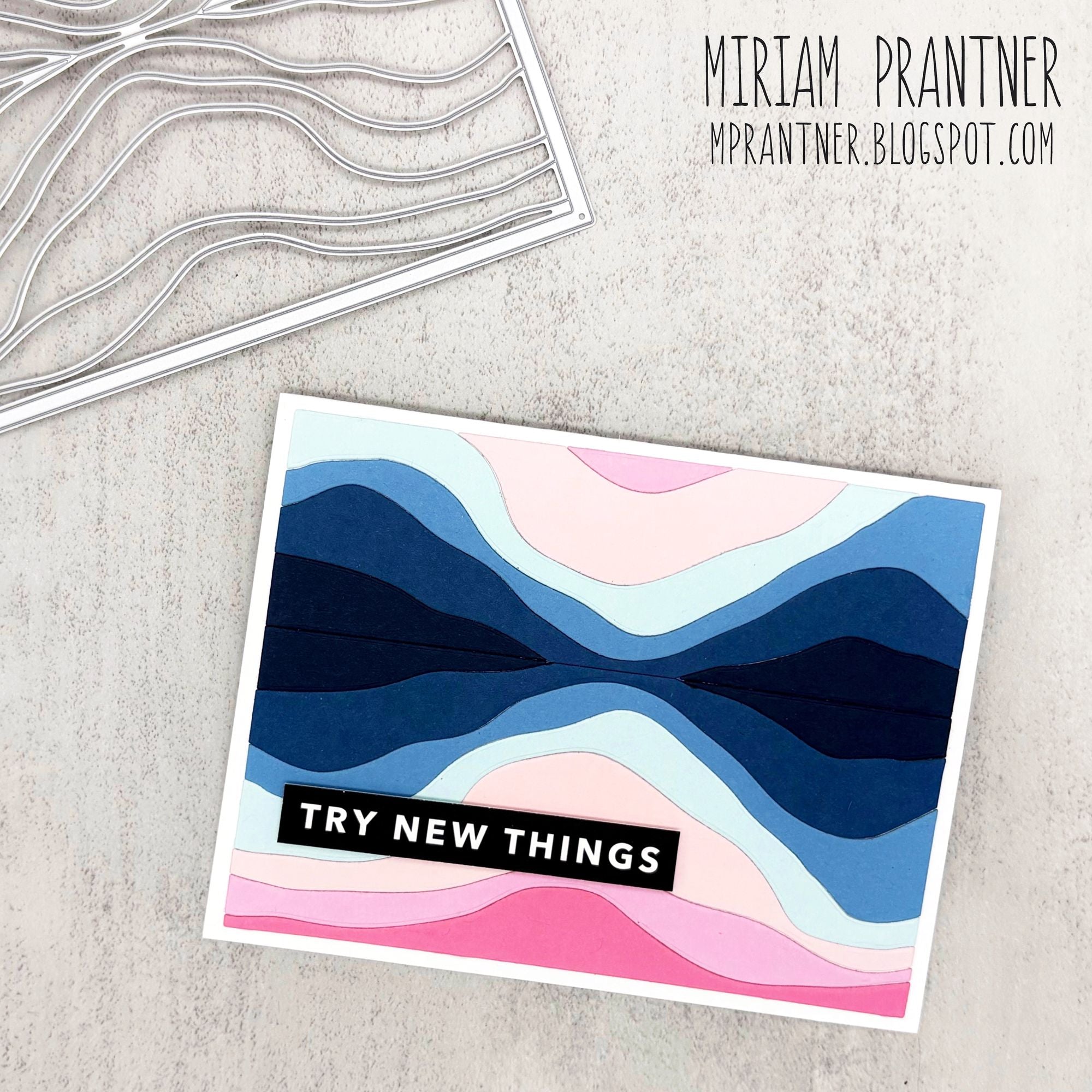 The Simon Says Stamp Mountain Horizon die plate cuts an abstract A2 horizontal background featuring a clean horizon line and flowing, wavy shapes that resemble layered mountain ranges.