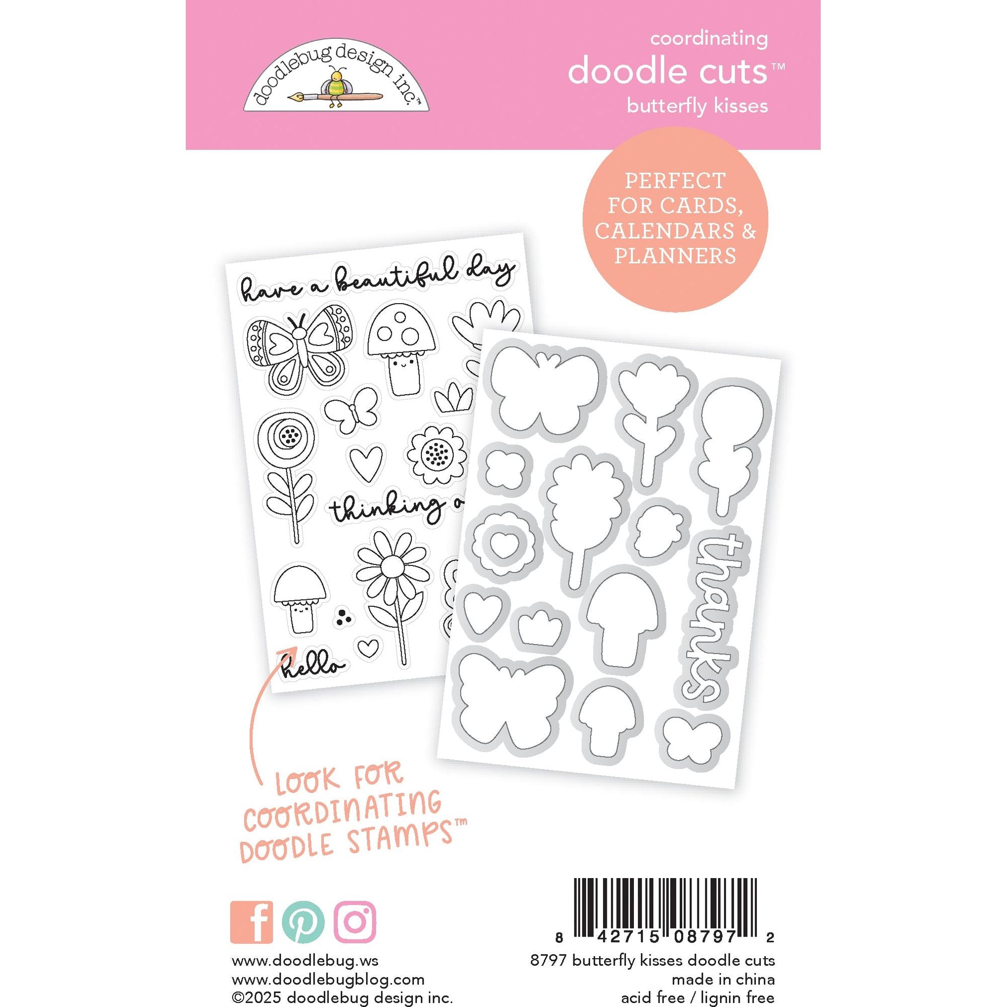 Make die cutting a breeze with the Doodlebug Butterfly Kisses Doodle Cuts Die Set! Designed to coordinate with the Butterfly Kisses Doodle Stamp set, this die set features many outlines to cut out shapes, and a sophisticated 'thanks' sentiment. Perfect for creating pretty floral scenes. Please refer to the coordinating stamp set for approximate dimensions.