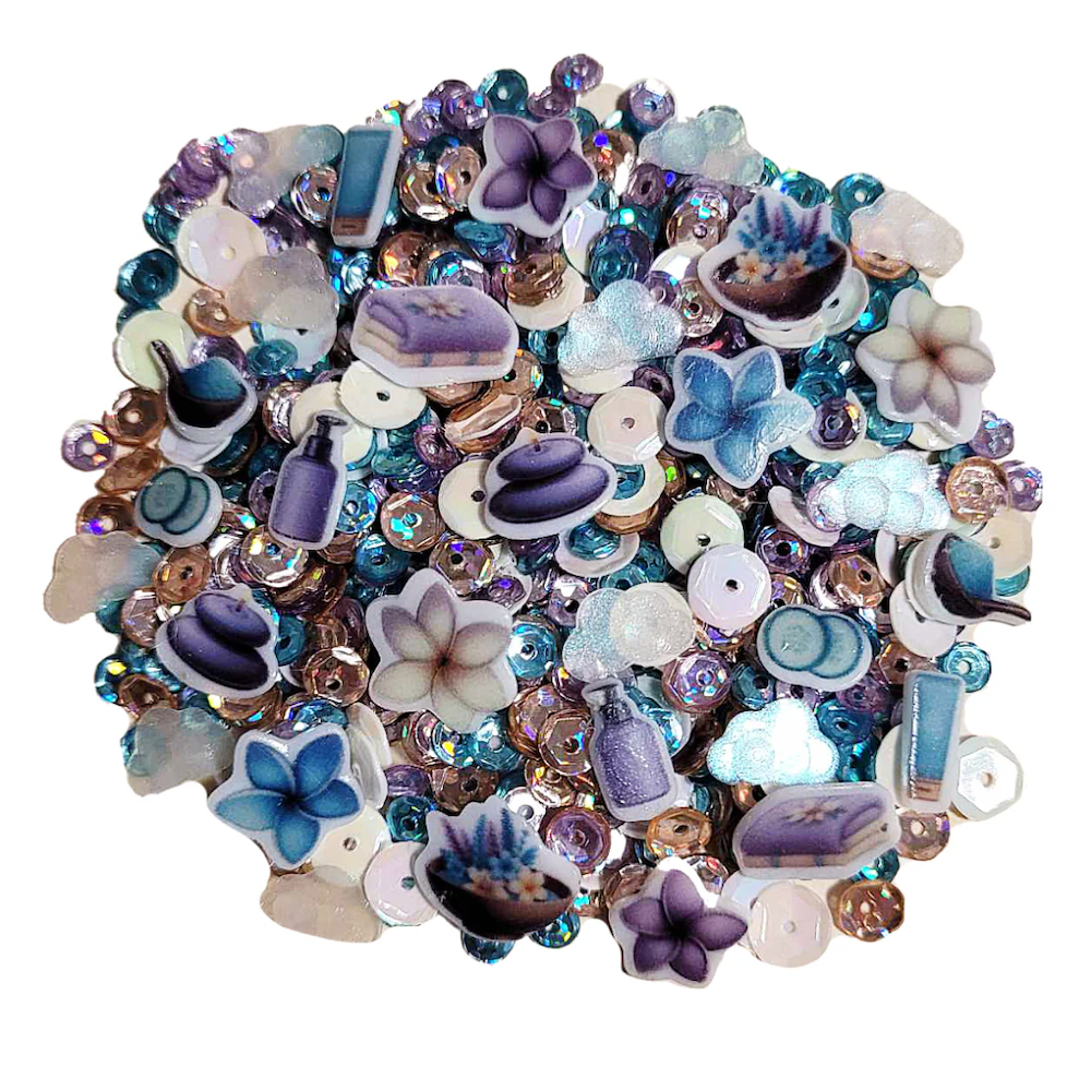 Relax and create with the Sweet November Stamps Spa Day Embellishment Mix! This soothing blend features calming lavender, refreshing teal, and shimmering iridescent accents, along with spa-inspired elements for a touch of serenity. Each 1-tablespoon pack is handcrafted and uniquely made. To preserve its beauty, avoid extended exposure to direct sunlight.