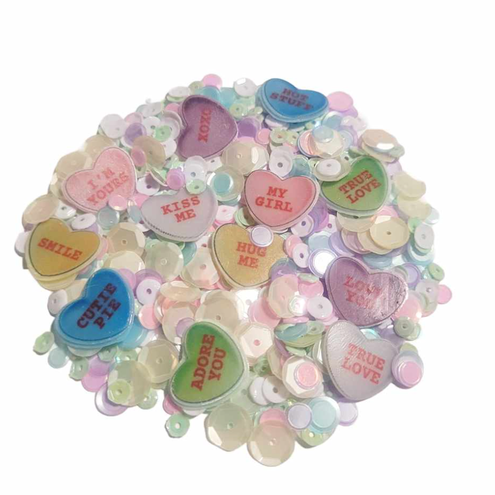 Indulge in the irresistible charm of conversation hearts this Valentine's season with Sweet November Stamps Sweet Talk Sequin Mixes. This alluring blend of pink, purple, yellow, blue, green, and white sequins, combined with SNS's Valentine-themed embellishments, offers endless crafting possibilities. With 36 sayings and 6 colored hearts in each packet, it's an exciting surprise for your creative projects.