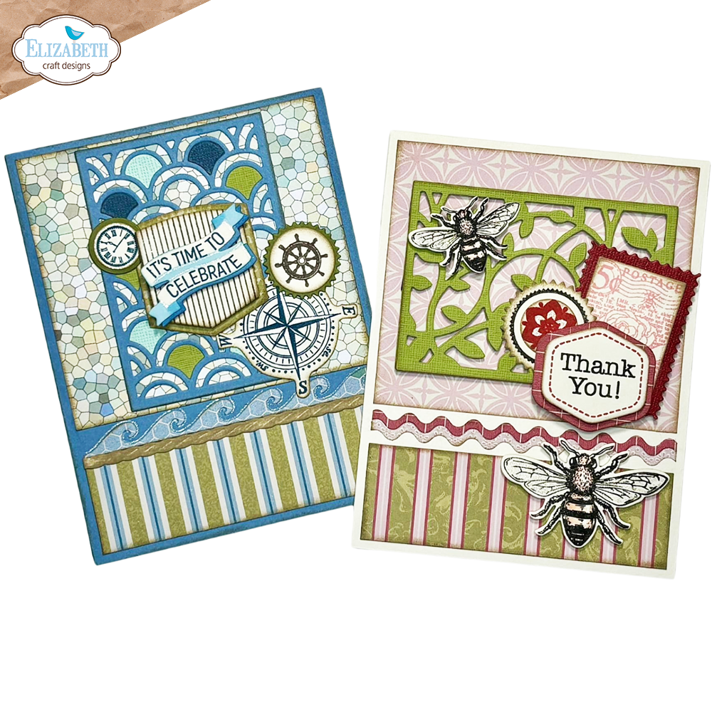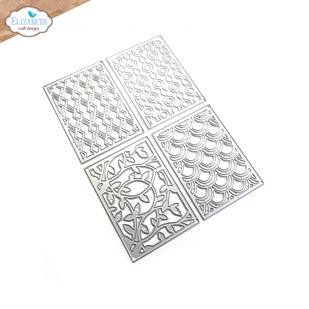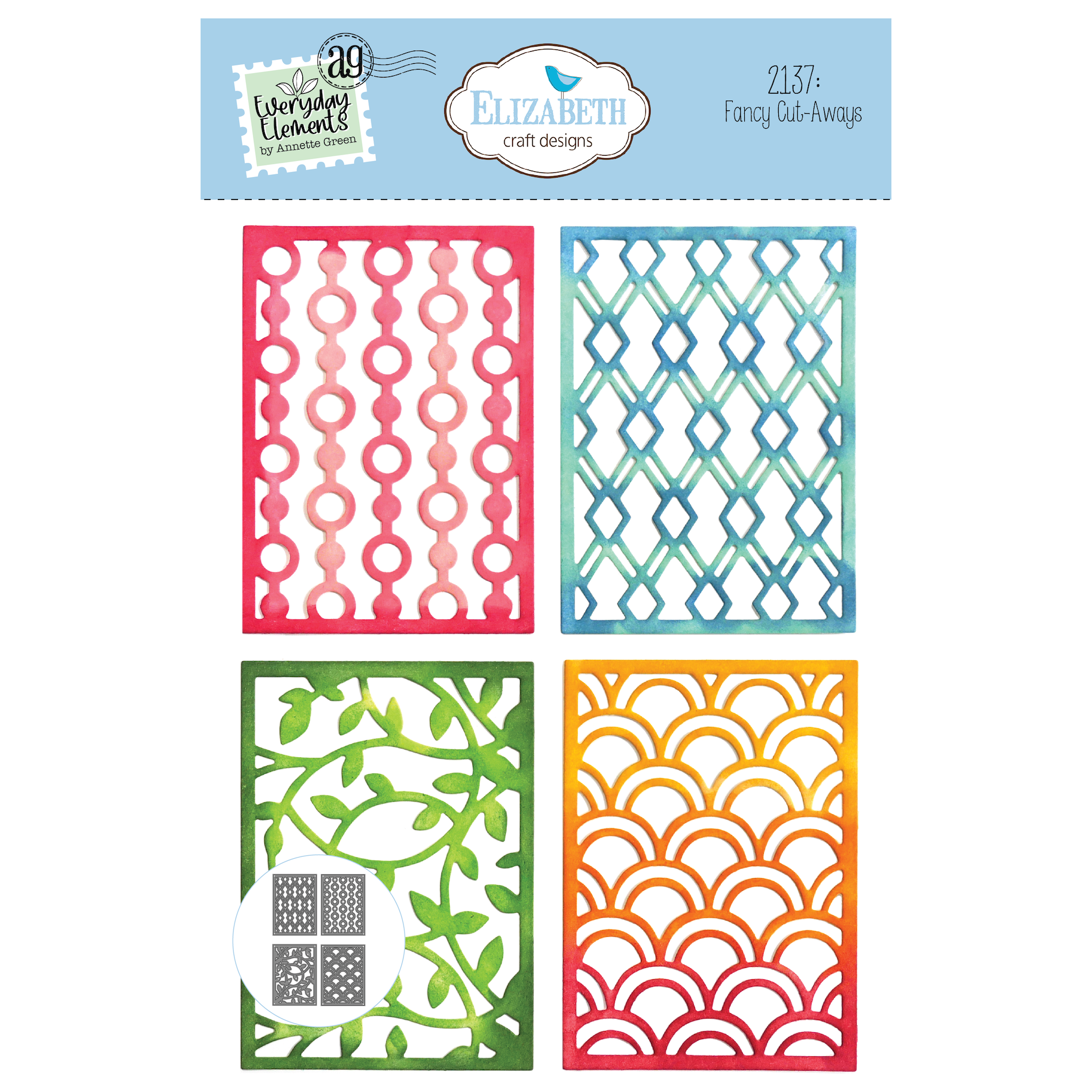 The Elizabeth Craft Designs Fancy Cut-Aways Dies are a captivating addition to the This Lovely Life Everyday Elements Collection. This set features 4 wafer-thin dies, with the largest measuring approximately 2.6 x 3.6 inches. Each die showcases a distinct design within a rectangle. You'll find a retro circle chain, a double diamond lattice, charming scallops, and intricate leafy vines. These dies provide endless creative possibilities, allowing you to effortlessly embellish your projects with elegant and intricate patterns.
