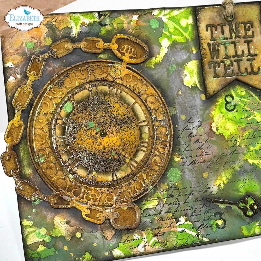Elizabeth Craft Designs Gentleman’s Timepiece Dies are part of the Mr. & Mrs. Art Journal Specials Collection. This wafer-thin die set includes 7 pieces, with the largest die measuring approximately 10 x 5.1 inches (27.1 cm x 13 cm). The set features an ornate pocket watch face and background, clock hands, a rectangle with a grungy edge, and two flag tags that say "Wow" and "Time will tell." These large dies are perfect for use with Square XL Art Journals AJ05 and AJ06, adding a vintage, timepiece-inspired touch to your projects.