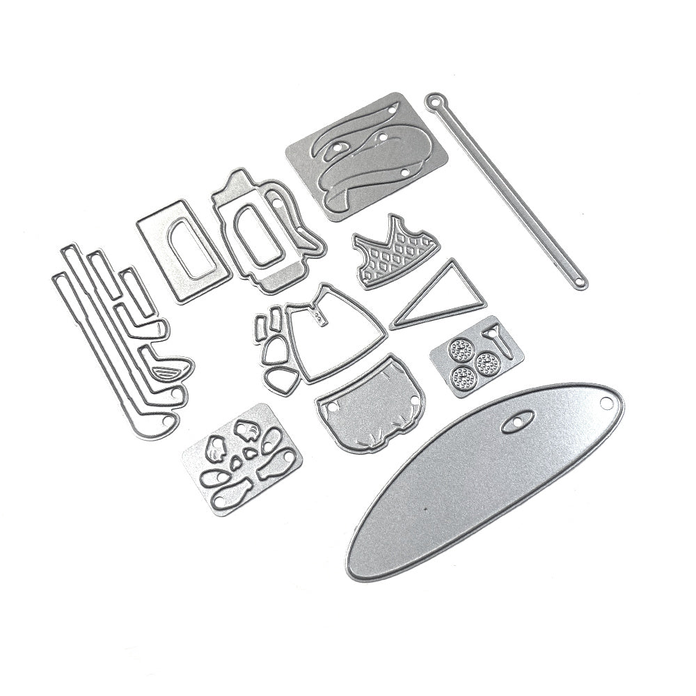 Elizabeth Craft Designs Golf Accessories Dies are part of the Good Times Cute & Whimsical Collection by Joset van de Burgt. This wafer-thin die set includes 13 pieces, with the largest measuring approximately 3.5 x 1.1 inches. Designs include golf balls, clubs, golf bag, green, hole, pole with flag, hat, sweater vest, gloves, and other golf apparel—perfect for crafting playful, golf-themed projects.