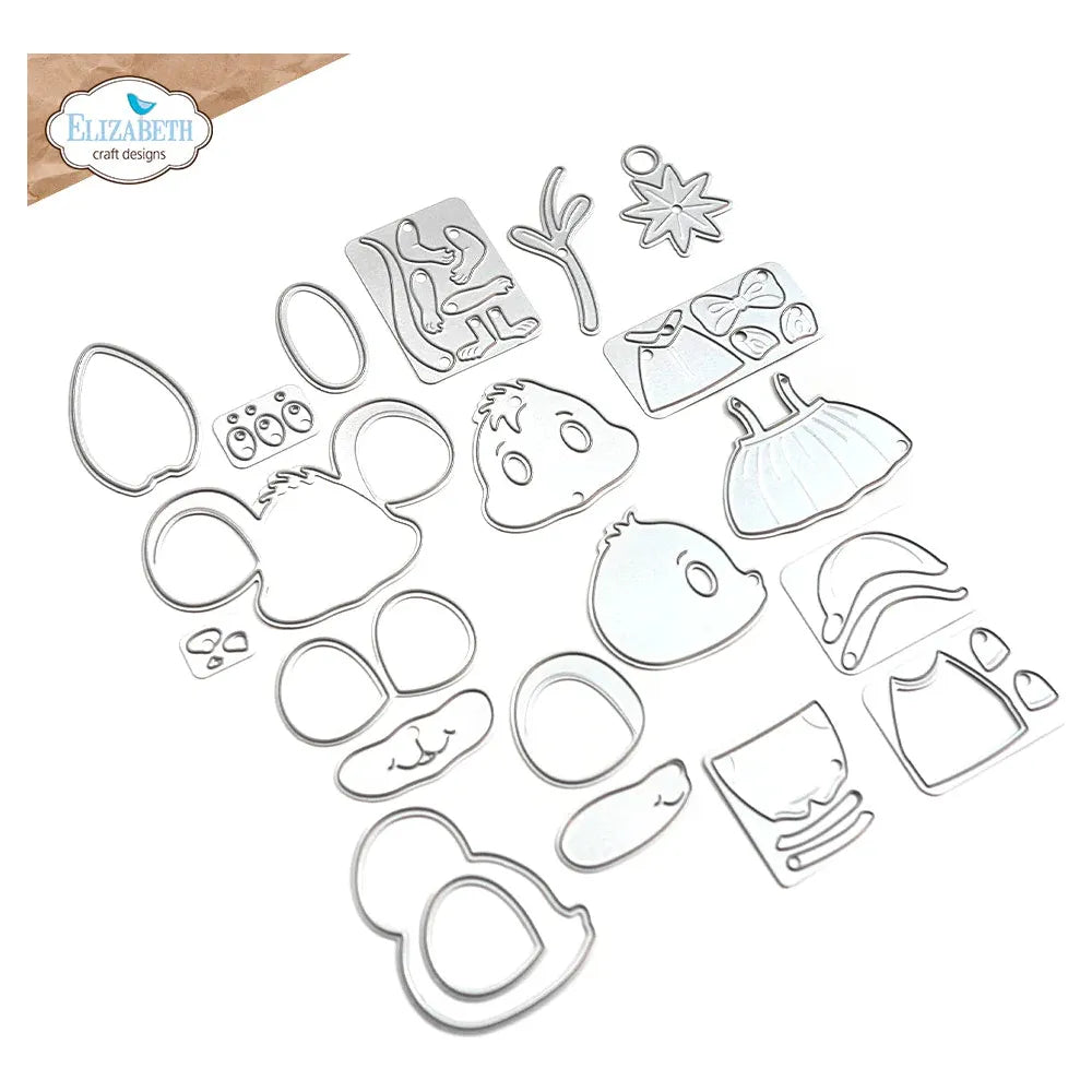 The Elizabeth Craft Designs Little Mouse Dies are part of the Cute & Whimsical Meet the Mice Collection, designed by Joset van de Burgt. This set includes 20 wafer-thin dies, with the largest die measuring approximately 2.9 x 1.7 inches. The set includes body parts and heads in different positions, allowing for a variety of poses, along with clothing options such as a dress, hat, bow, overalls, shirt, and a flower. It coordinates perfectly with the Fall Accessories Dies 2206 and Boot Dies 2208, giving you endless creative possibilities to dress and position your mice in adorable scenes.