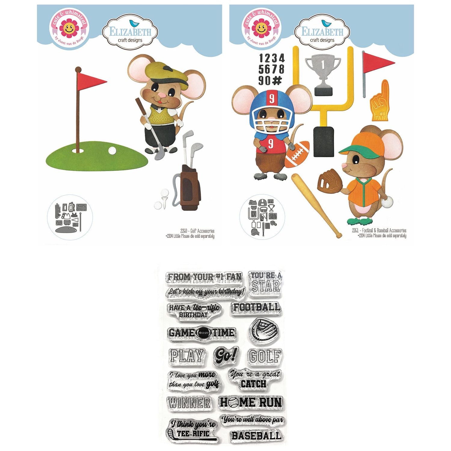 Elizabeth Craft Designs Mouse Sports Accessories Stamps and Dies Bundle, part of the Good Times Cute & Whimsical Collection by Joset van de Burgt, includes Sport Sentiments Clear Stamps CS412, Football and Baseball Accessories Dies 2261, and Golf Accessories Dies 2260.