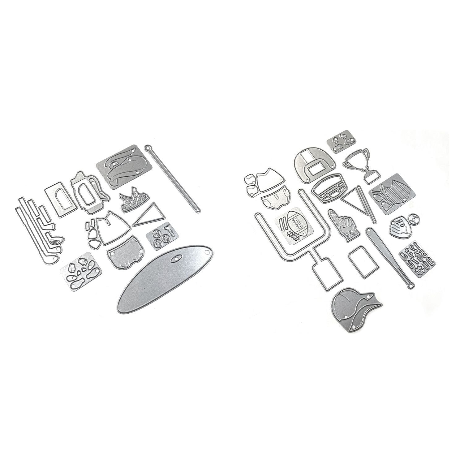 Football and Baseball Accessories Dies 2261 includes 16 pieces (largest approximately 2.1 x 3.9 inches), featuring a goal post, trophy, numbers, #1 Fan foam finger, helmet, shoulder pads, uniforms, football, baseball bat, ball, cap and glove, cleats, and a pennant.