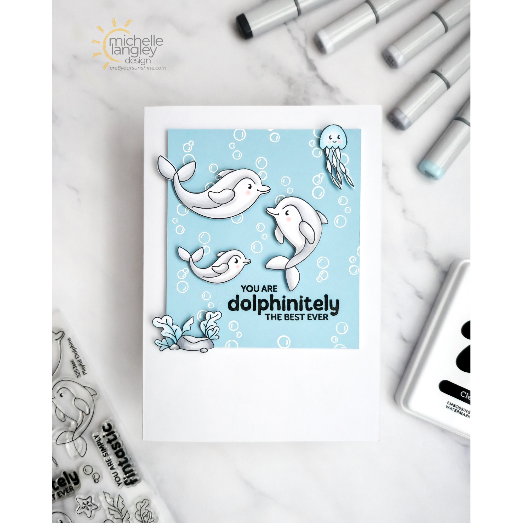 Make a splash in your card making with the Simon Says Stamp Playful Dolphins stamps. This versatile set showcases lively dolphins leaping and diving alongside graceful jellyfish, cascading bubbles, and a variety of undersea rocks and plants—everything you need to build vibrant ocean scenes.