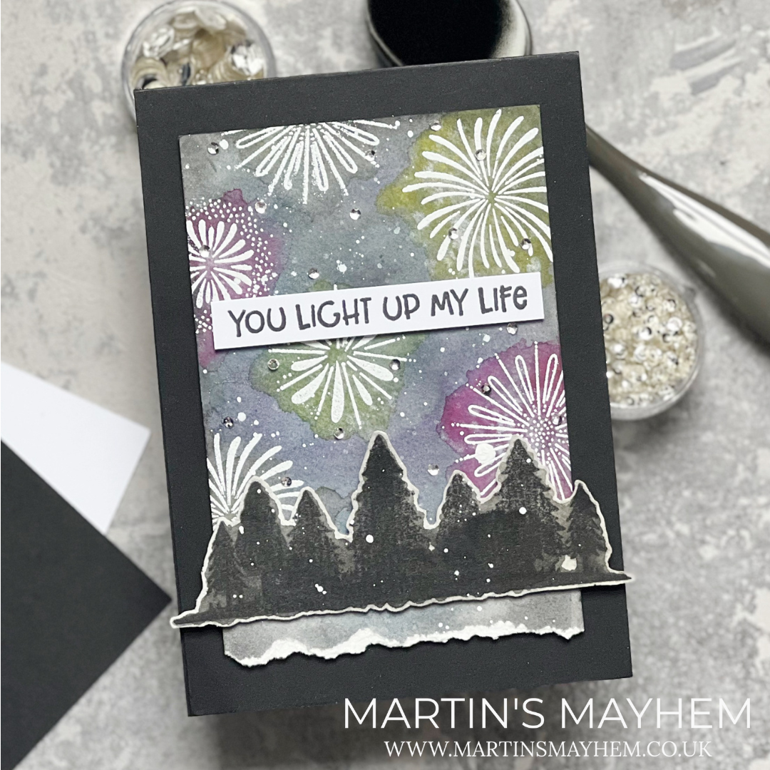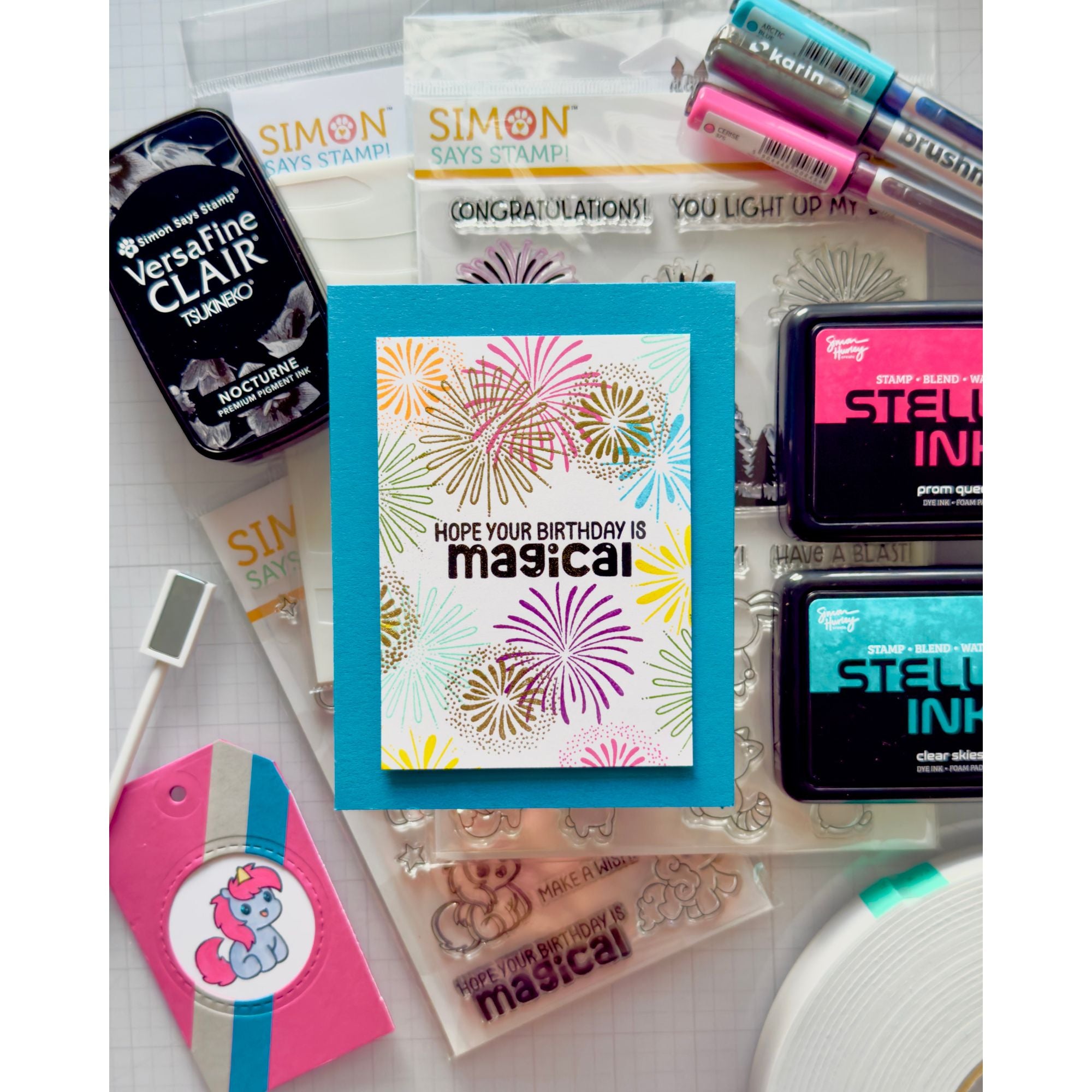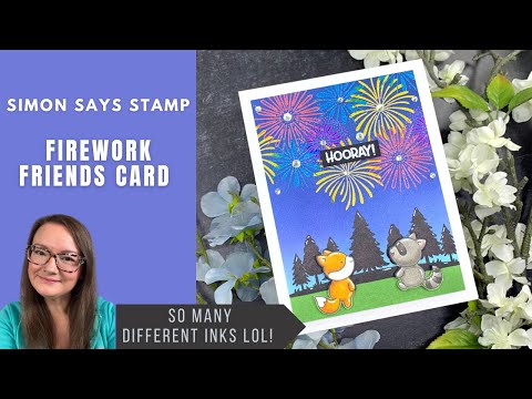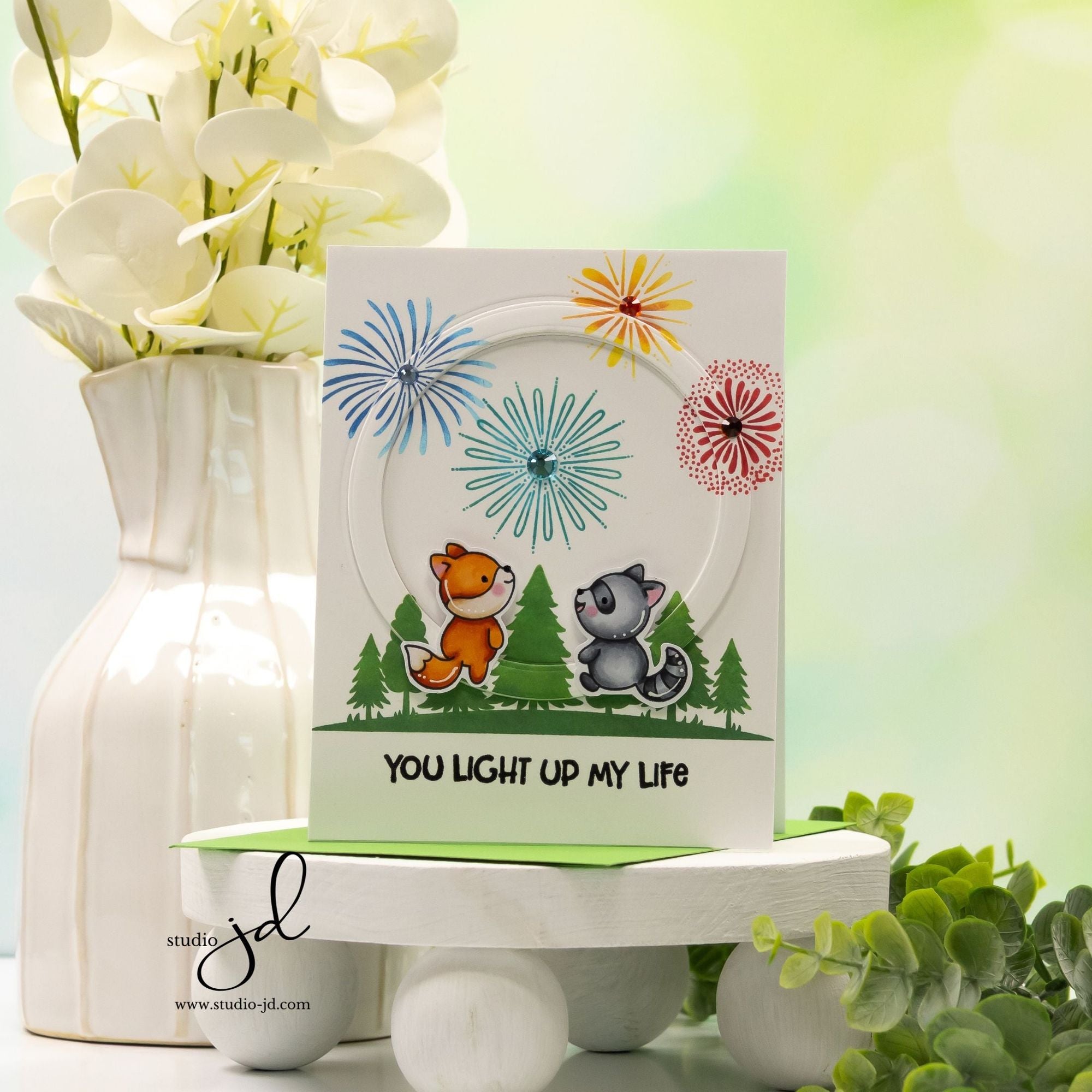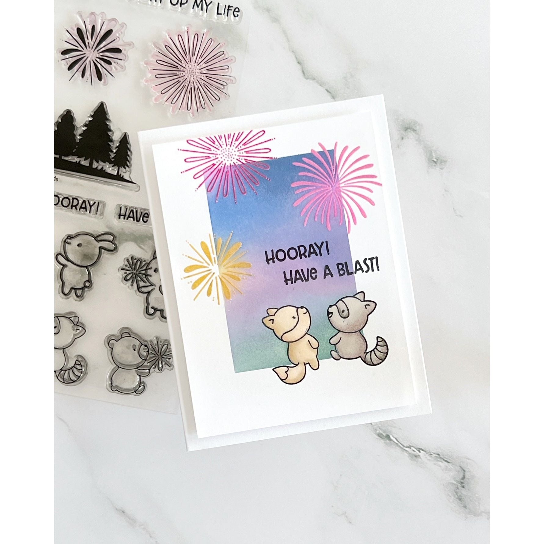 The Simon Says Stamp Firework Friends stamp set lights up your projects with festive fun! This delightful set features several bursts of fireworks, a silhouetted bank of evergreen trees, and eight adorable critters—some waving sparklers, all gazing in wonder at the display.