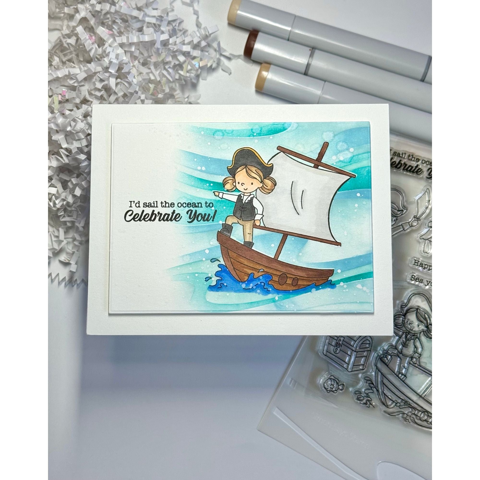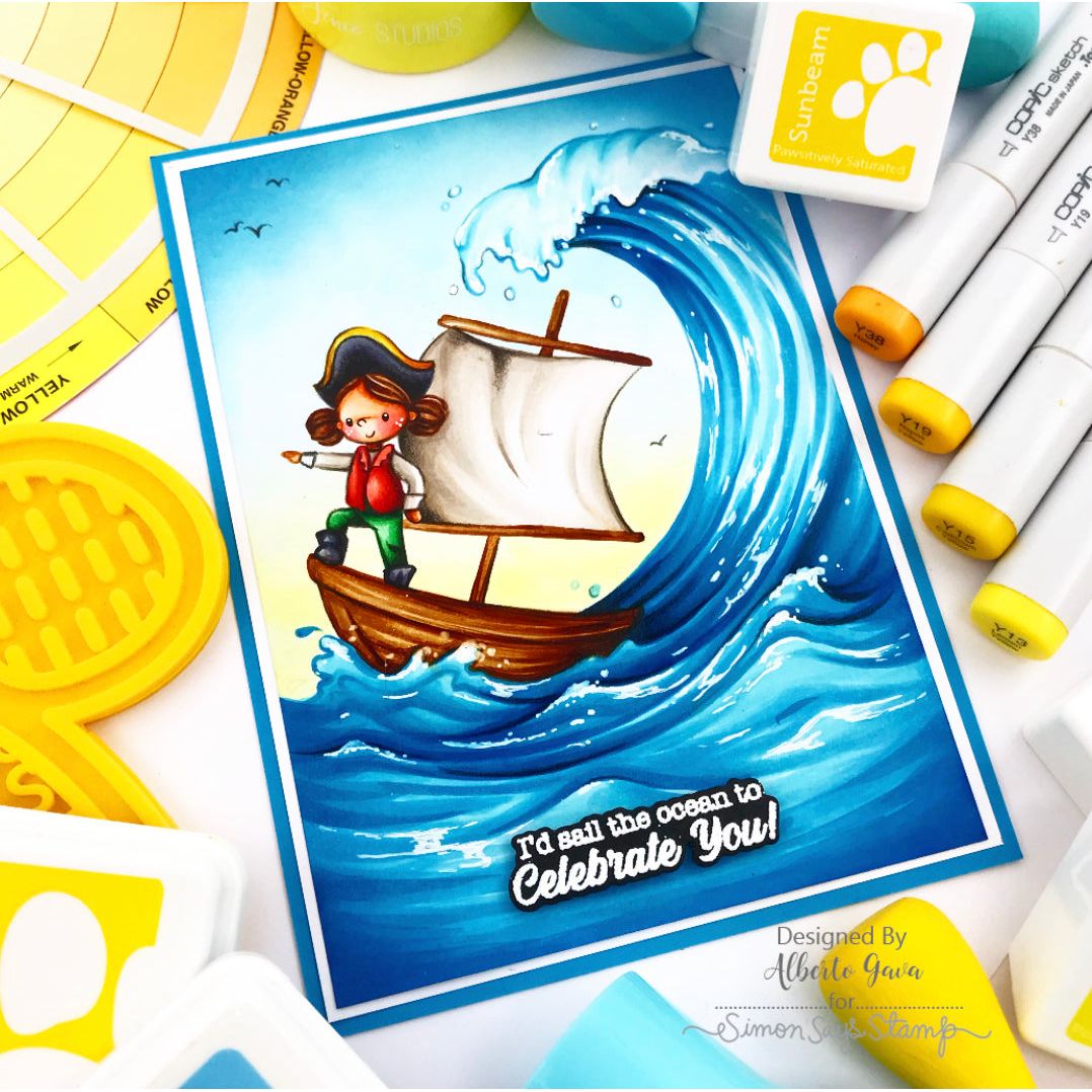 Set sail for adventure with the Simon Says Stamp Ahoy, Matey stamps and dies! This playful set features three swashbuckling children in classic pirate poses—brandishing a sword, peering through a telescope, and striking a jaunty pose on the prow of a ship.