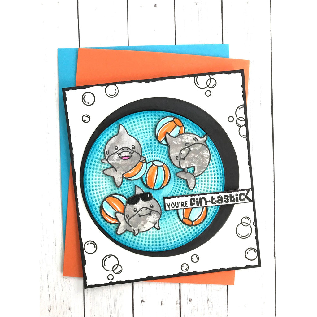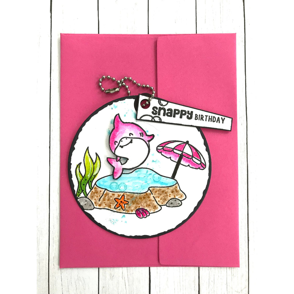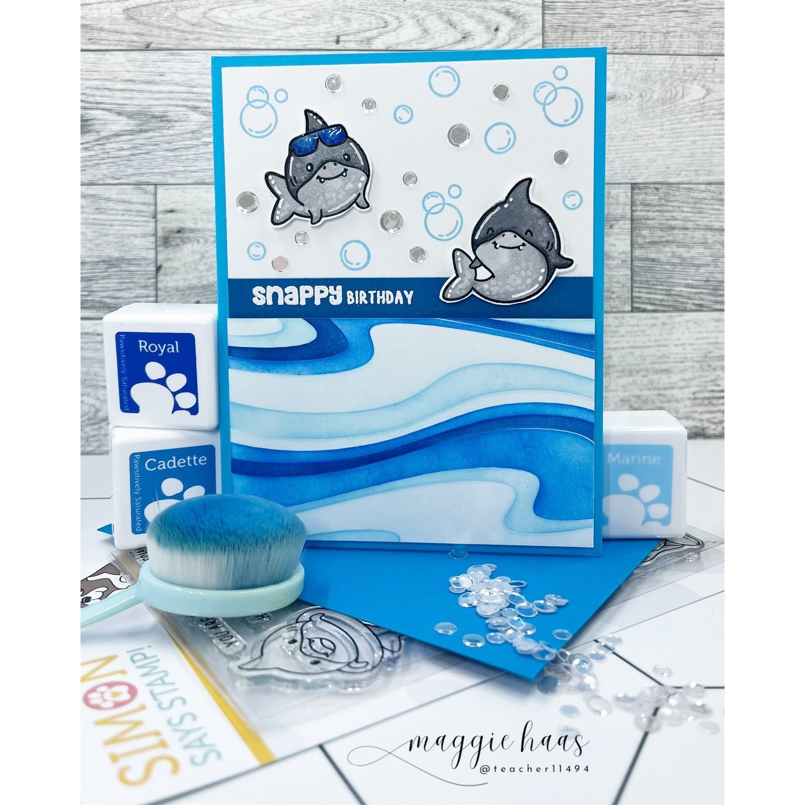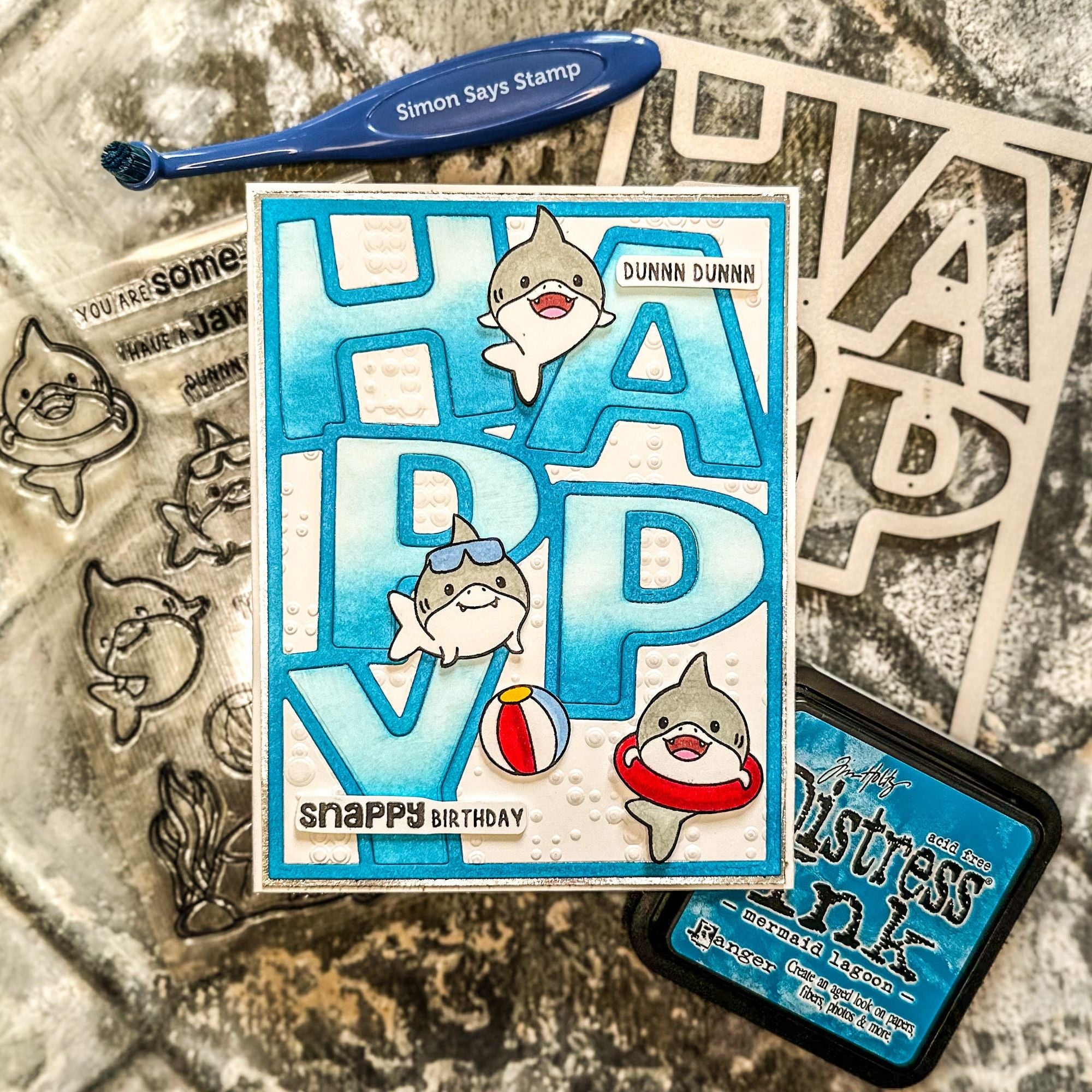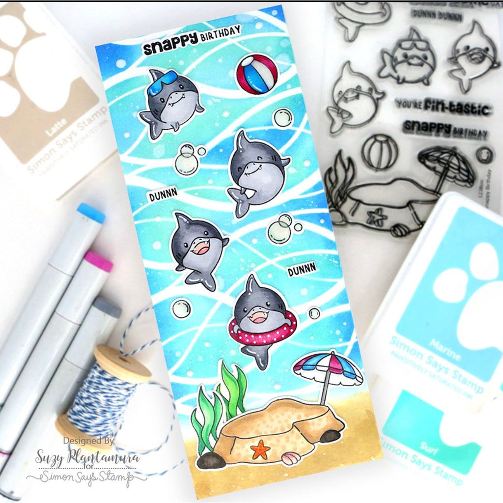 Make a splash with the Simon Says Stamp Snappy Birthday stamps and dies! This fun-filled set features smiling sharks ready to party, along with playful accessories like an inner tube, beach ball, sunglasses, and floating bubbles. An ocean floor scene—complete with a ledge, seaweed, and a beach umbrella—sets the stage for your underwater celebration. The dies cut out all of the images and sentiments.