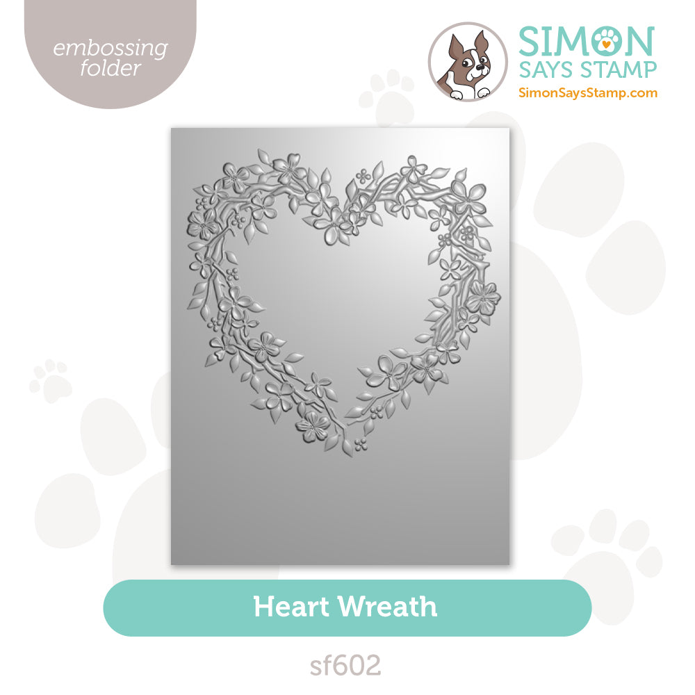 The Simon Says Stamp Heart Wreath embossing folder creates beautiful raised texture featuring a floral wreath in the shape of a heart. The heart design is centered near the top of the panel, leaving open space below that’s perfect for sentiments or embellishments.