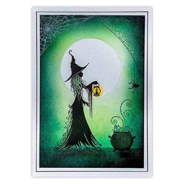 This mystical witch has flowing curls that are mirrored in her full skirts and pointed hat. Her long, hanging sleeves showcase a delicate cobweb effect, adding to her enchanting appearance. She carries a rounded lantern, casting a magical glow. Stamp size: 5cm x 10cm.
