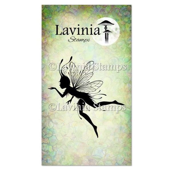 The Lavinia Stamps Lumus Large Clear Stamp is a silhouette stamp of a flying fairy named Lumus. This is the larger size, with a smaller version available separately. Lumus is depicted with textured clothing and detailed wings, extending her hand out, making her the perfect addition to a scene.