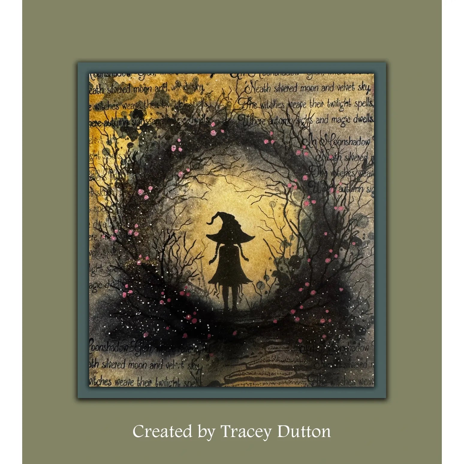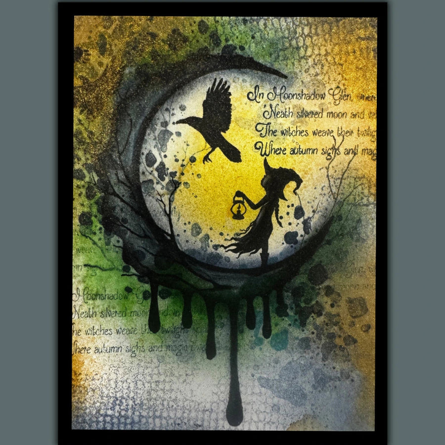 Sentiment Reads: In moonshadow glen, where ravens fly, neath silvered moon and velvet sky, The witches weave their twilight spells, Where autumn sighs and magic dwells.