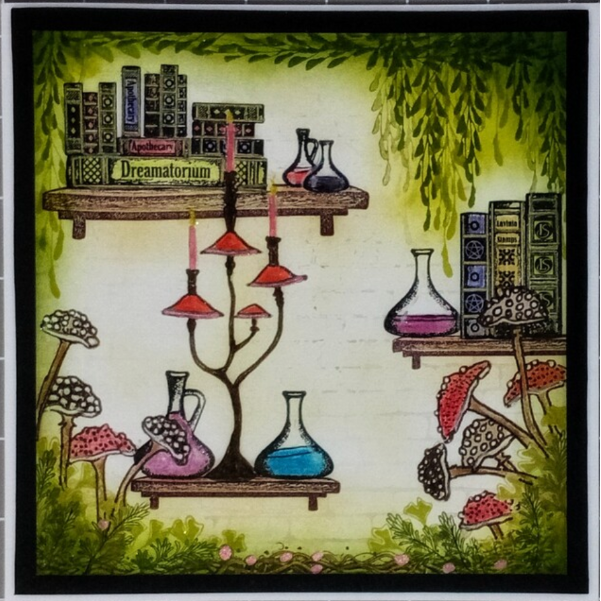 Two of the stamps depict grouped books in varying sizes with geometric spine designs, ideal for filling shelves with magical detail. The third features a single book titled Apothecary, adding a whimsical, storybook touch.